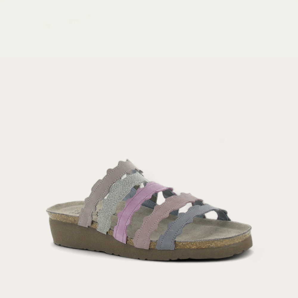 The Adina slide is sure to brighten up any Spring day with its soft, seasonal hues and scalloped edged straps in nubuck and leather. This sandal has three gore straps for adjustability. Naot's anatomic cork and latex footbed is wrapped in a pampering suede and molds to the shape of the foot with wear. American Podiatric Medical Association (APMA) Accepted for promoting good foot health.