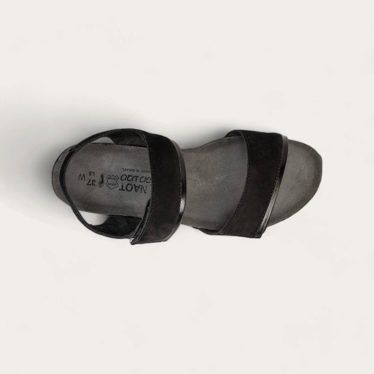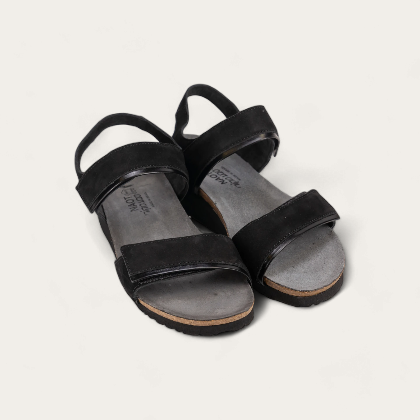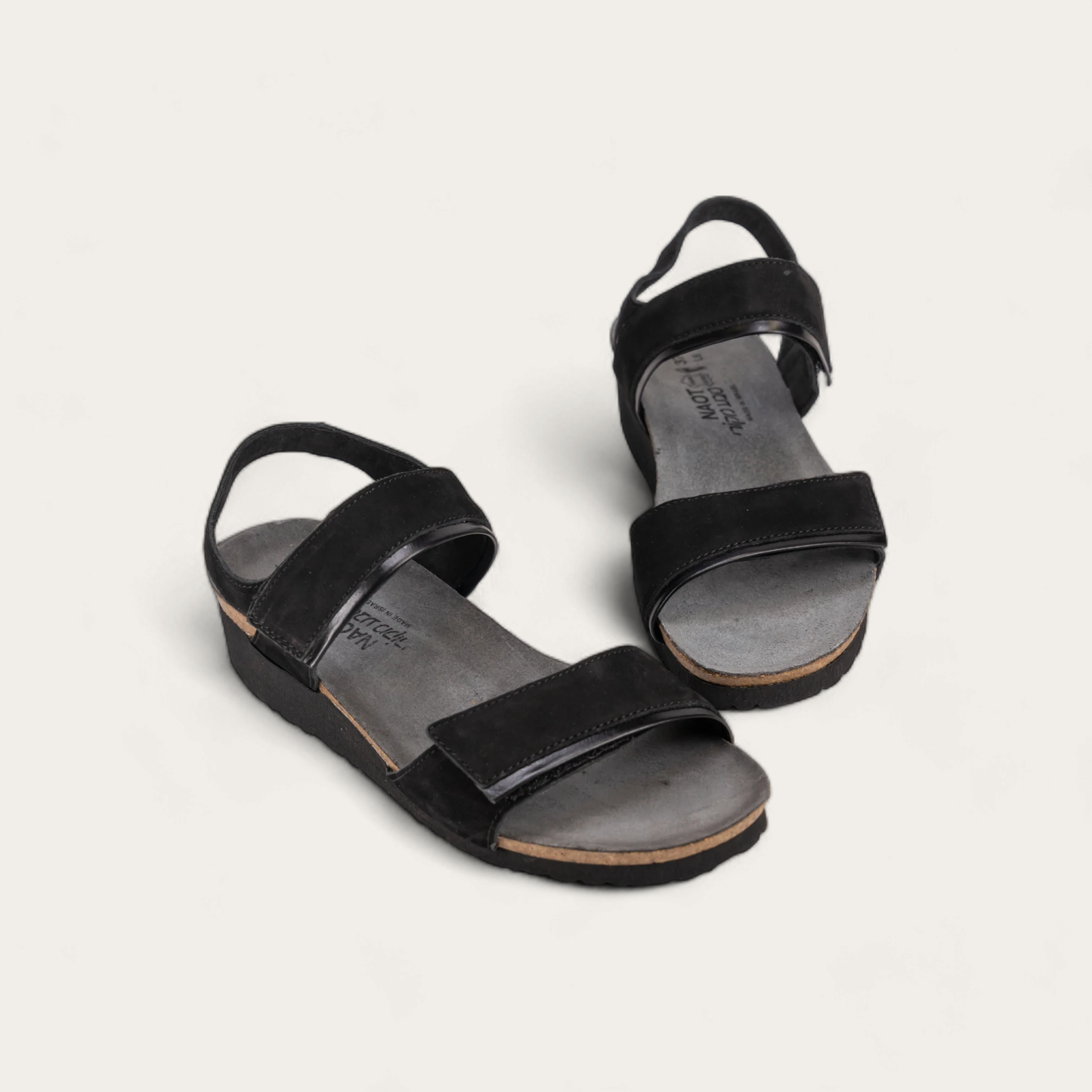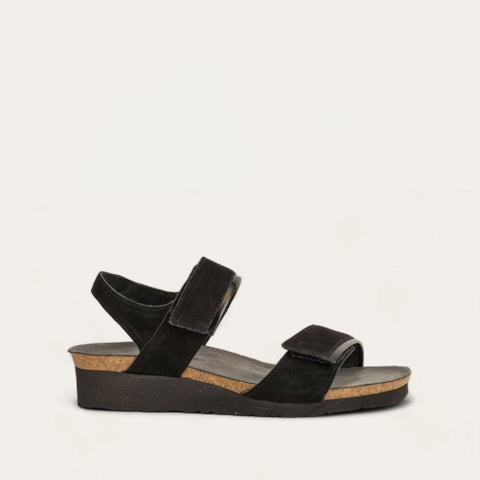 A contrasting leather detail on both straps the Aisha has the perfect edgy flare. Hook and loop straps couple with this feature to make the shoe a comfortable must have. The full coverage design offers ultimate support. Naot's anatomic cork and latex footbed is wrapped in a pampering suede and molds to the shape of the foot with wear. American Podiatric Medical Association (APMA) Accepted for promoting good foot health.