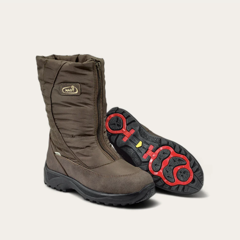 The Alaska is part of the Naot Outdoor Collection. This waterproof midcalf snow boot is perfect for even the coldest winter days with a 4 layer weather tech lining that is rated -20C/-4F. The slip resistant rubber sole features an innovative on/off OC Grip System with stainless steel studs allowing you to walk comfortably on icy surfaces. The Alaska features Naot's removable anatomic cork and latex footbed and a front zipper for accessibility.
