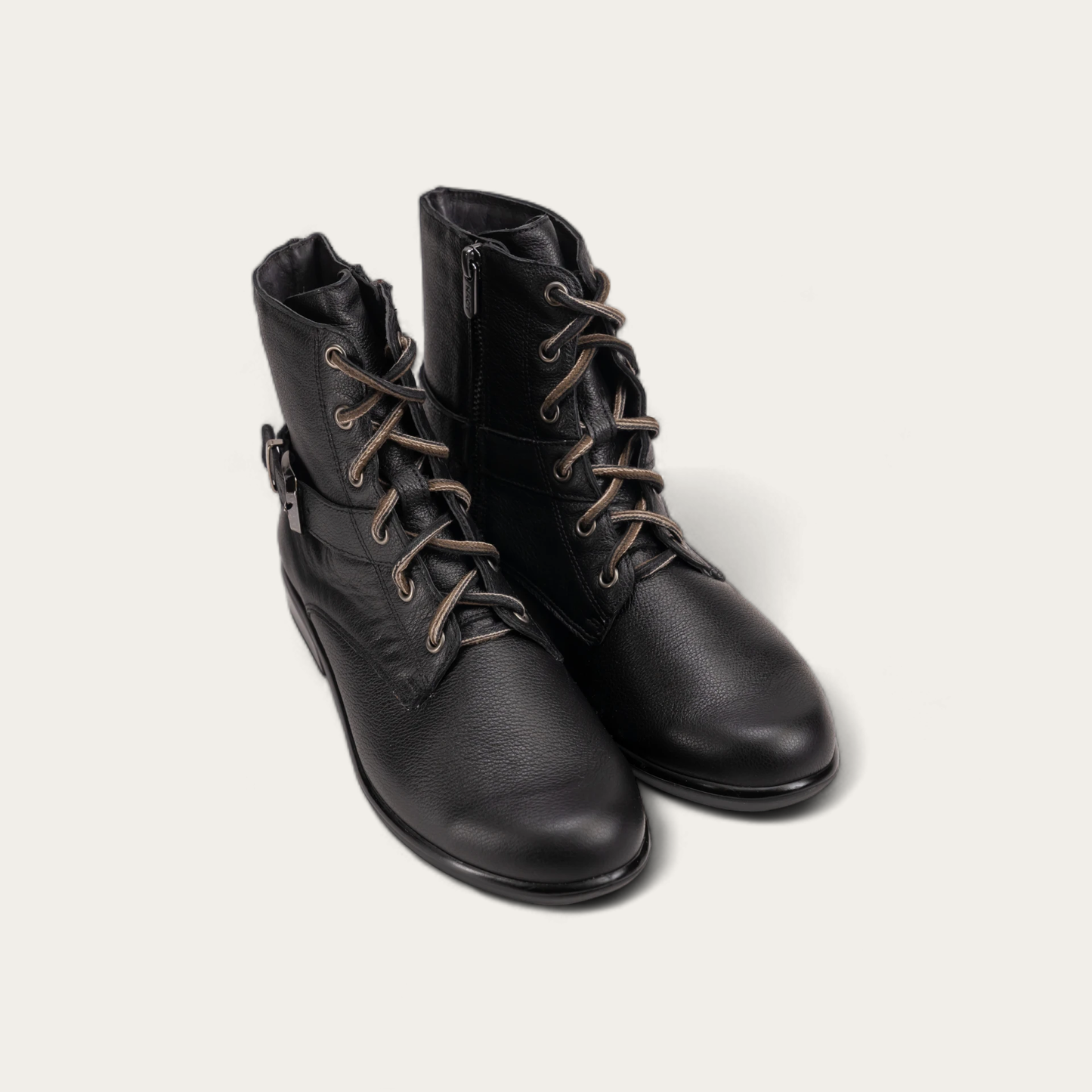The Naot Alize is fashionable boot that provides a sleek and dressy look. This style features a hook and loop faux buckle as well as a side zipper. This boot has padded technical lining for comfort, warmth and moisture absorption. Naot's removable, anatomic cork and latex footbed is wrapped in microfiber and leather and molds to the shape of the foot with wear. The Aura Collection features a 1.5" polyurethane sole with a metal shank which is extremely lightweight, durable and abrasive to prevent slipping. This collection uses a hand-sewn Strobel construction making it strong and extremely flexible. Our patented Naot Replacement Footbeds are available for Alize.