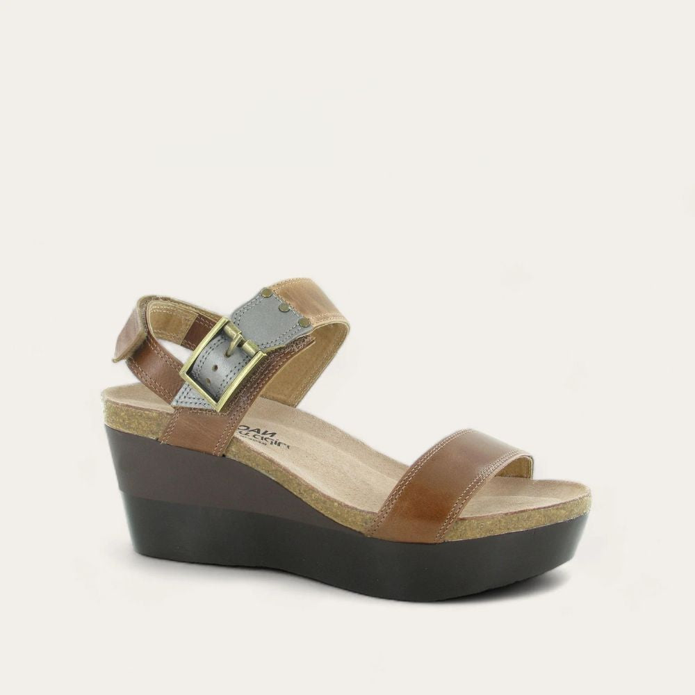 The Alpha is a trendy wedge sandal with a padded front strap for ultimate comfort. This style has a hook and loop backstrap and a faux buckle hook and loop strap at the instep. The instep strap has contrasting leather and rivet accents. Naot's anatomic cork and latex footbed is wrapped in a pampering suede and molds to the shape of the foot with wear. This style has a 3" polyurethane sole.