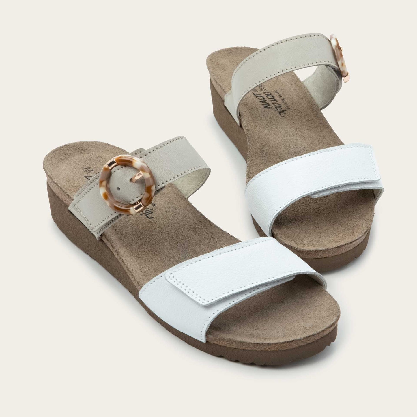 Looked at tons of summer shoes -raffia, etc. not one is as beautiful (or comfortable as these. . Got them in the white/soft ivory combination. Beautiful tortoise fake button with velcro hidden underneath.