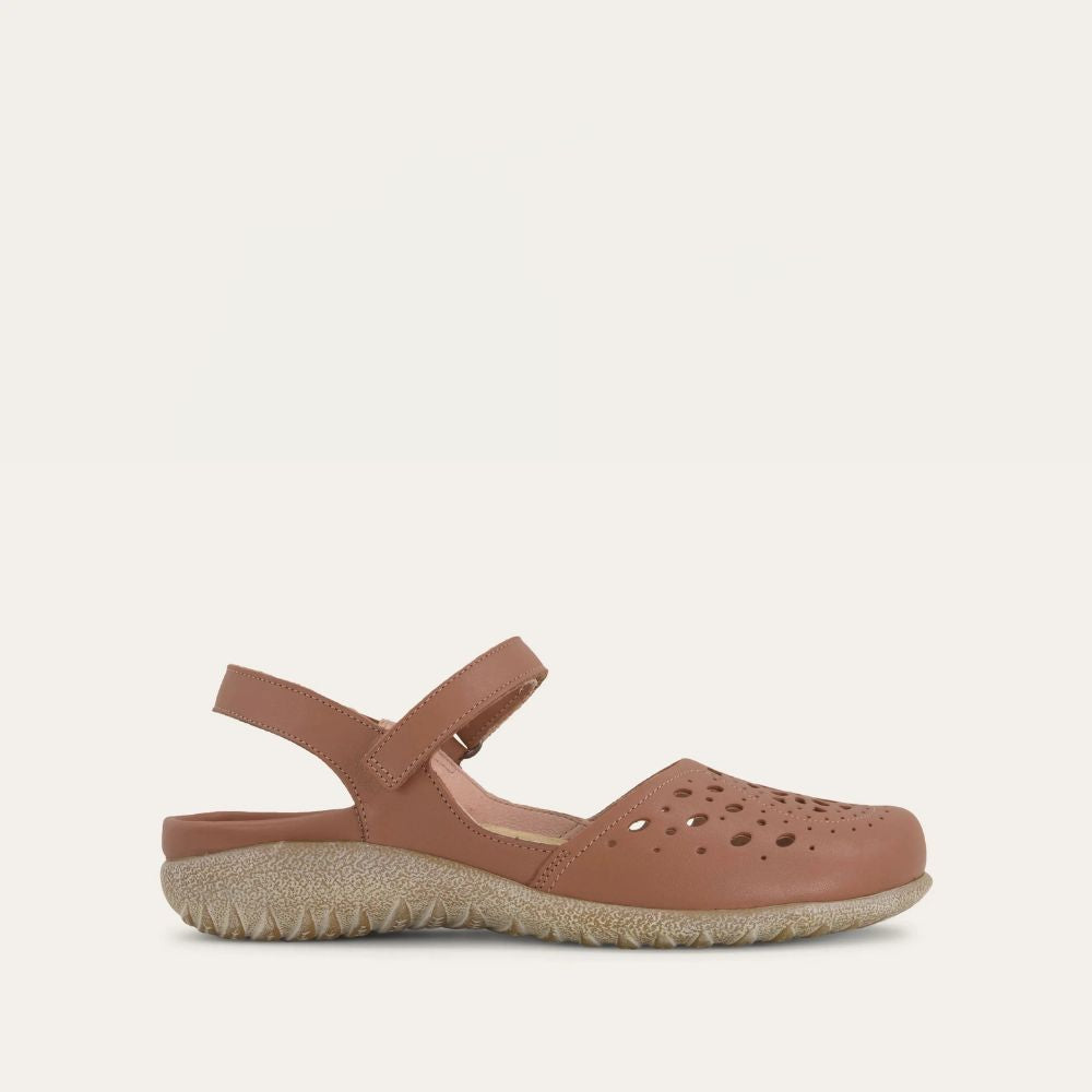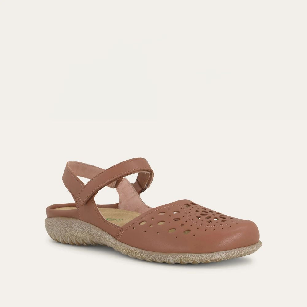 The Arataki is a closed toe slingback shoe with unique cutout designs. This style has a hook and loop closure at the instep. Naot's removable, anatomic cork and latex footbed is wrapped in pampering suede and molds to the shape of the foot with wear. The Koru Collection features a 1" polyurethane sole which is extremely lightweight, durable and slip resistant. This collection uses a hand-sewn Strobel construction making it strong and extremely flexible. American Podiatric Medical Association (APMA) Accepted for promoting good foot health. Our patented Naot Replacement Footbeds are also available for Arataki.