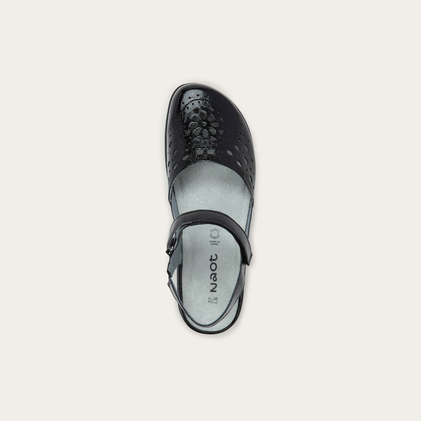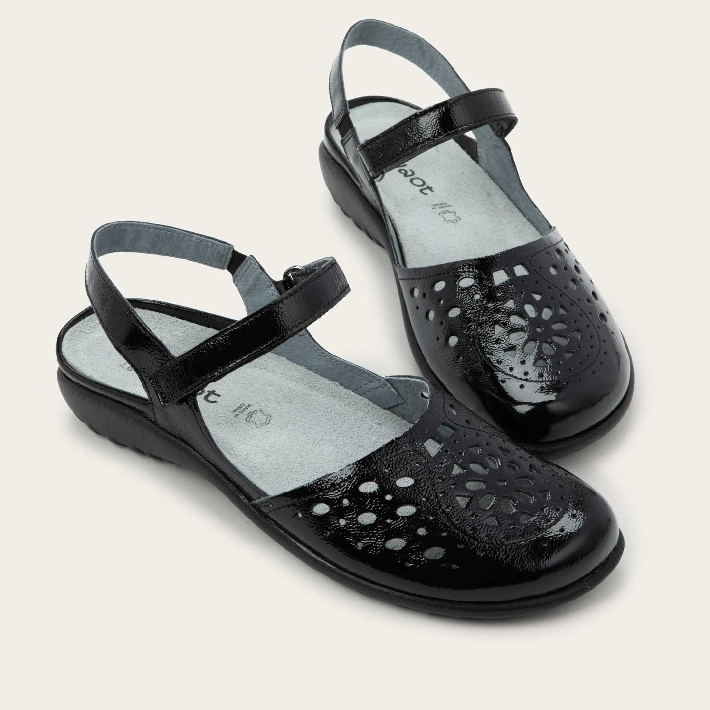 The Arataki is a closed toe slingback shoe with unique cutout designs. This style has a hook and loop closure at the instep. Naot's removable, anatomic cork and latex footbed is wrapped in pampering suede and molds to the shape of the foot with wear. The Koru Collection features a 1" polyurethane sole which is extremely lightweight, durable and slip resistant. This collection uses a hand-sewn Strobel construction making it strong and extremely flexible. American Podiatric Medical Association (APMA) Accepted for promoting good foot health. Our patented Naot Replacement Footbeds are also available for Arataki.