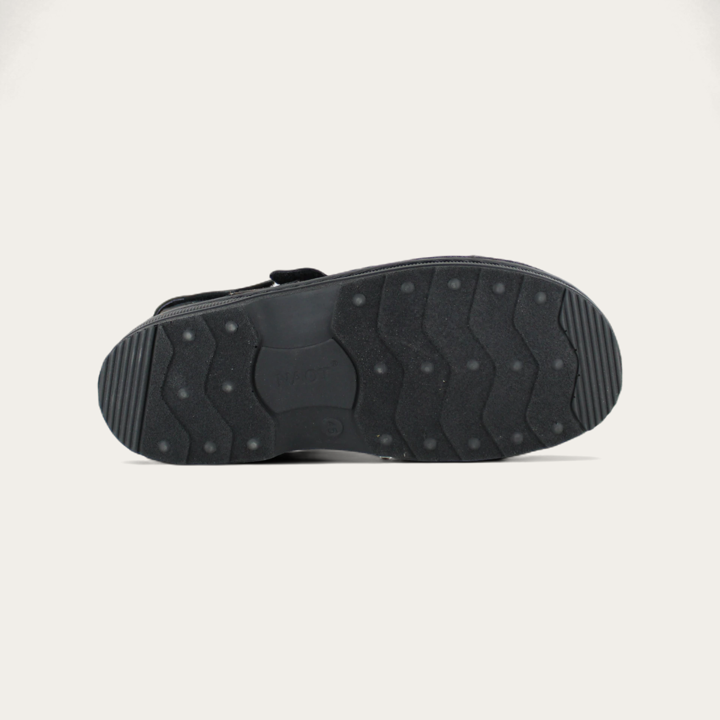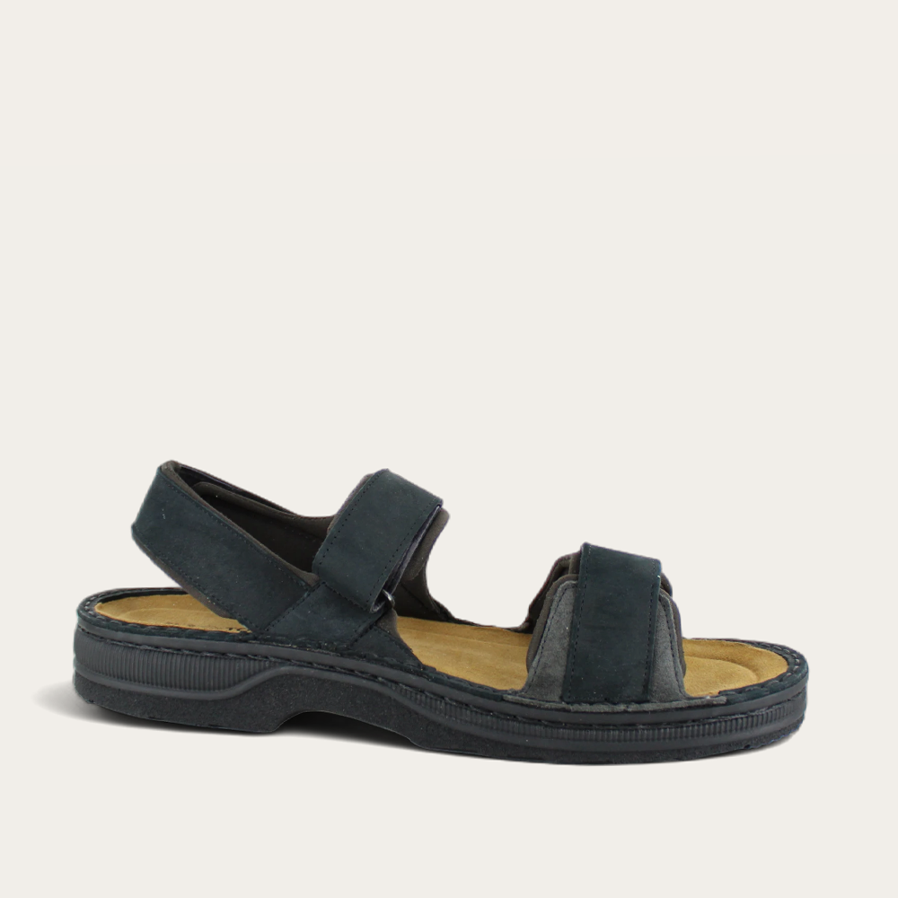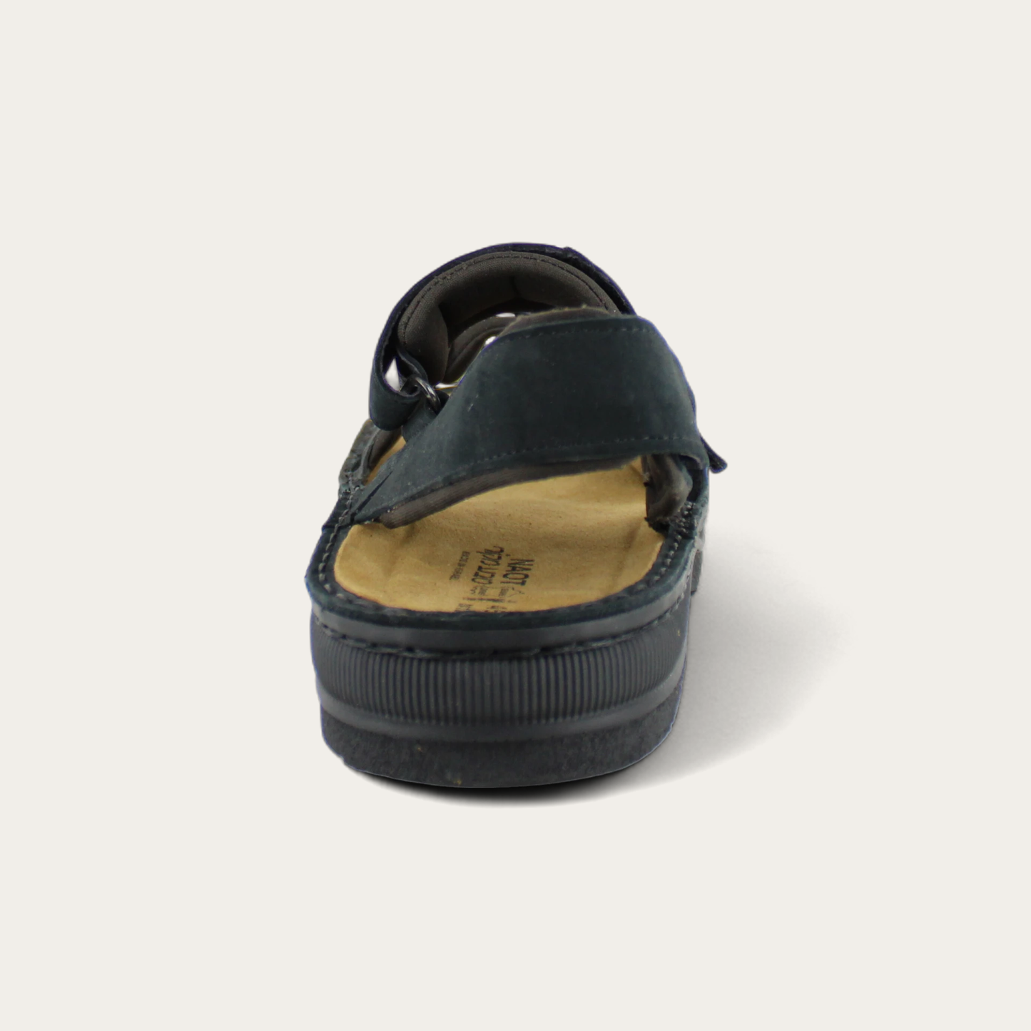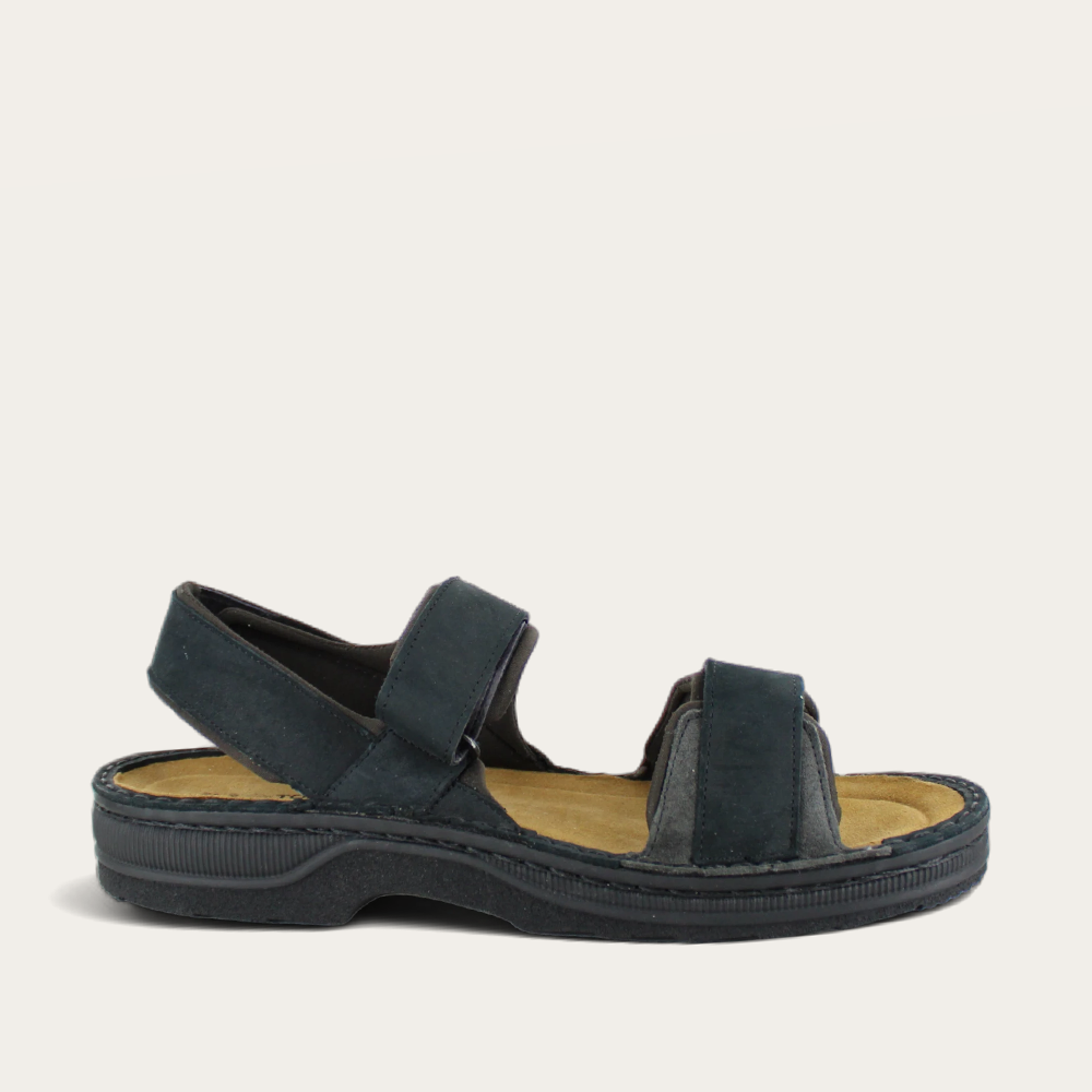 The Arthur is a fully adjustable backstrap sandal with three hook and loop straps. Naot's removable, anatomic cork and latex footbed is wrapped in pampering suede and molds to the shape of the foot with wear. The Men's Scandinavian Collection features a 1.5" polyurethane sole which is extremely lightweight, durable and slip resistant. American Podiatric Medical Association (APMA) Accepted for promoting good foot health. Our patented Naot Replacement Footbeds are also available for Arthur.
