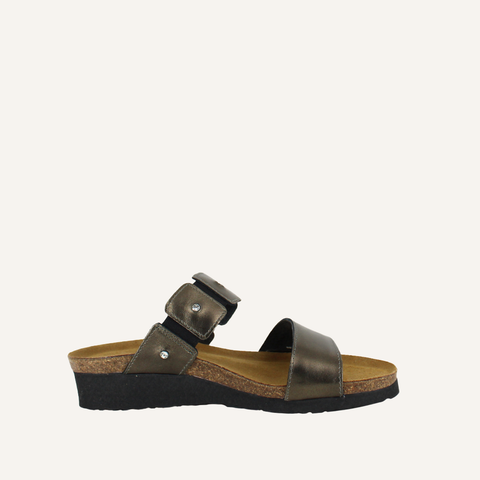 The Naot Ashley is a feminine slide sandal with rhinestone accents across the instep and gore for adjustability. Naot's anatomic cork and latex footbed is wrapped in a pampering suede and molds to the shape of the foot with wear. American Podiatric Medical Association (APMA) Accepted for promoting good foot health.