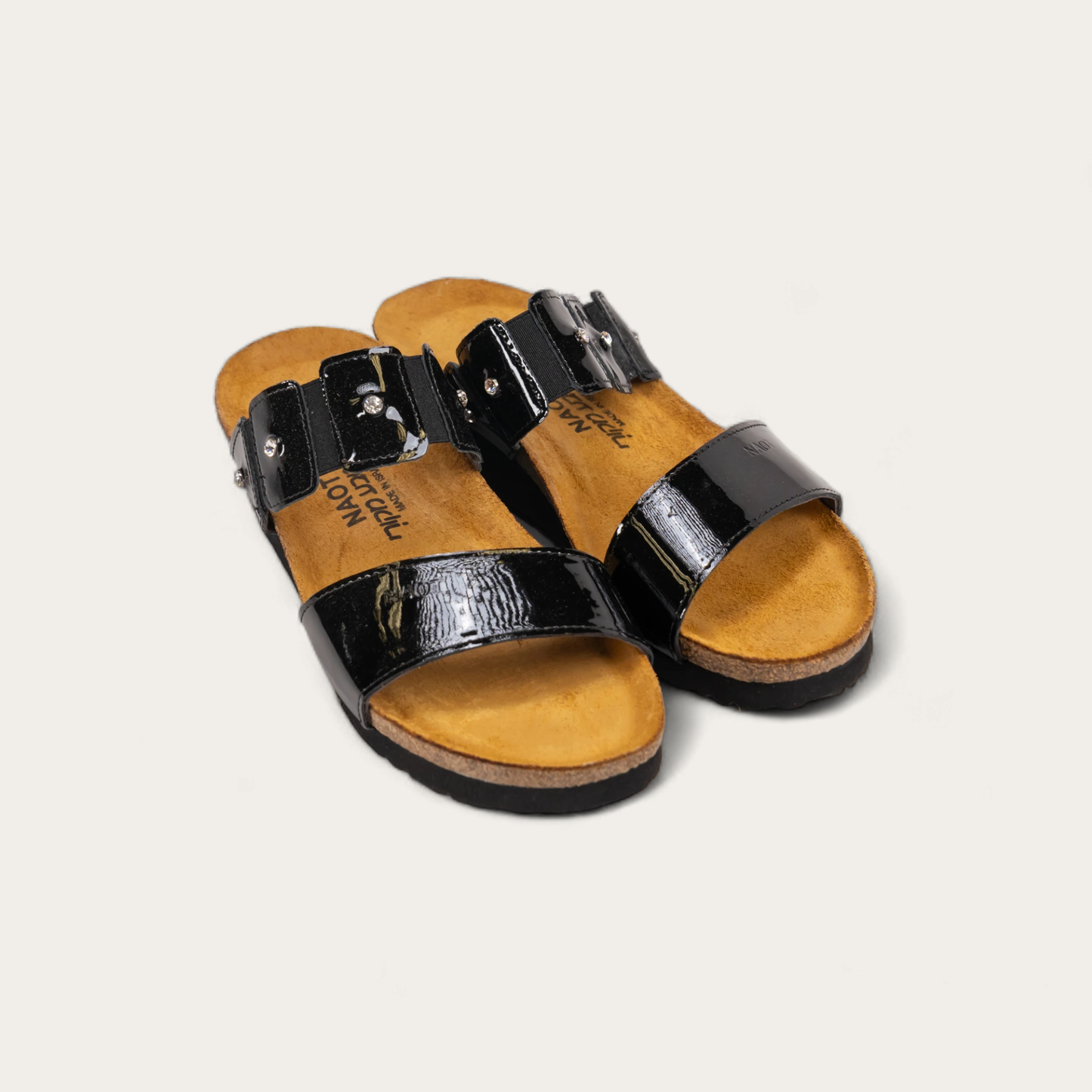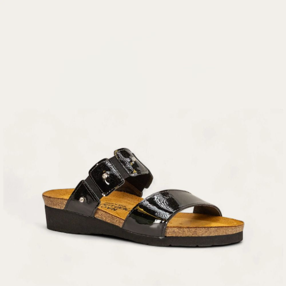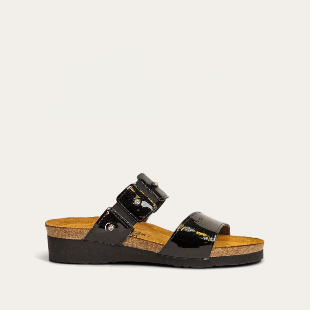 The Naot Ashley is a feminine slide sandal with rhinestone accents across the instep and gore for adjustability. Naot's anatomic cork and latex footbed is wrapped in a pampering suede and molds to the shape of the foot with wear. American Podiatric Medical Association (APMA) Accepted for promoting good foot health.