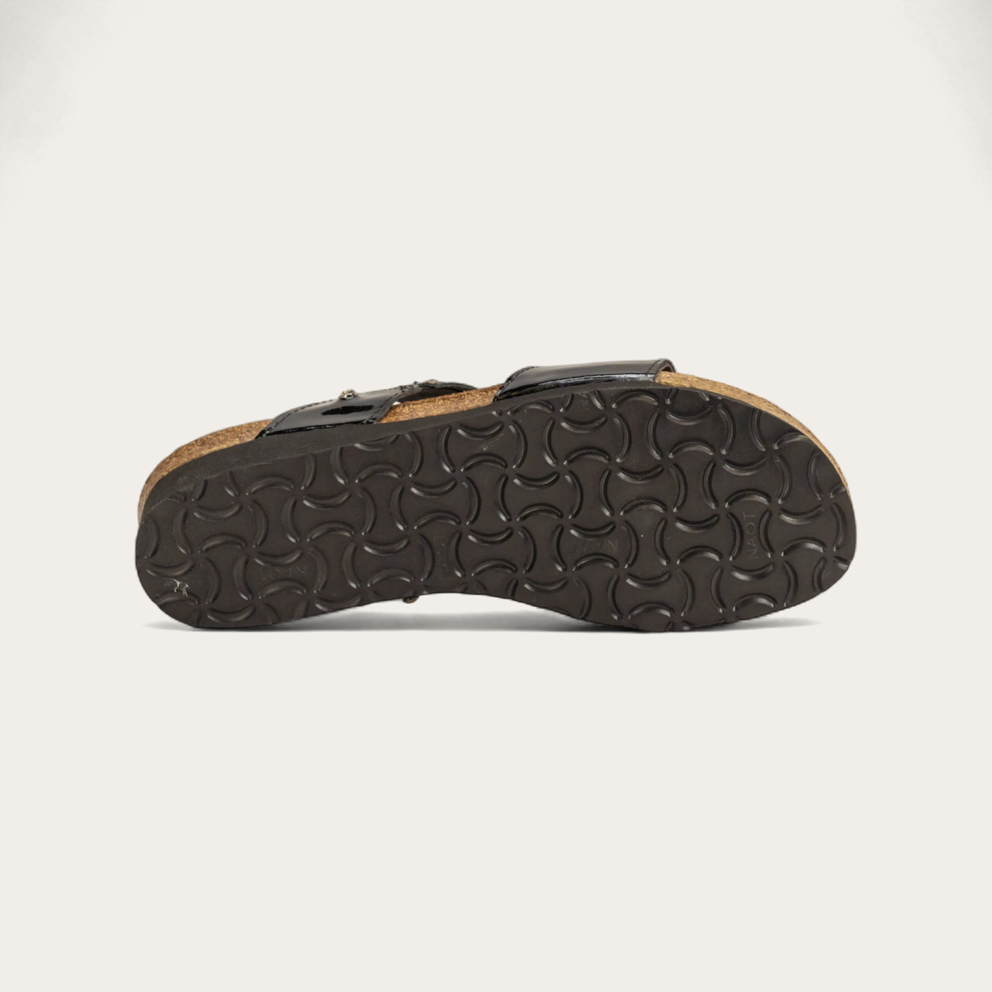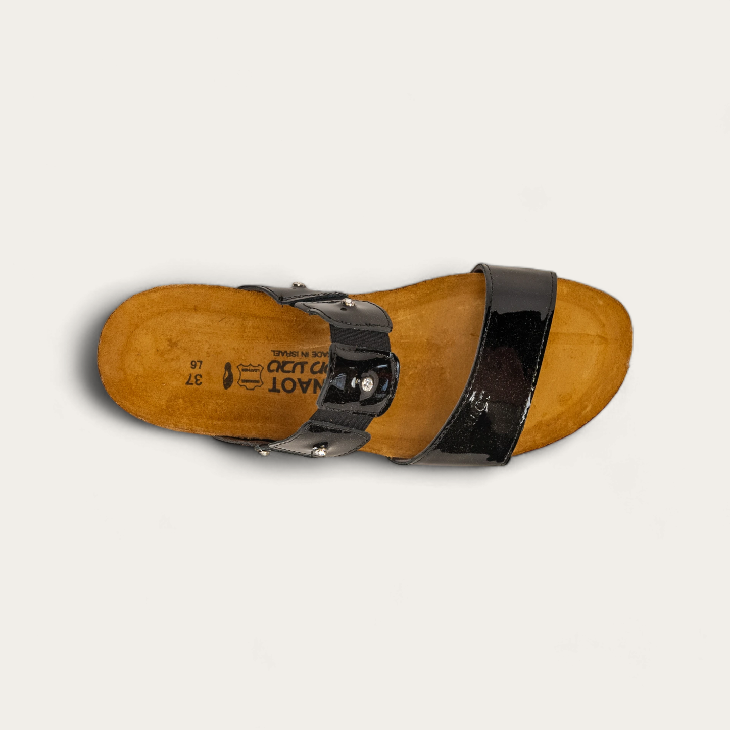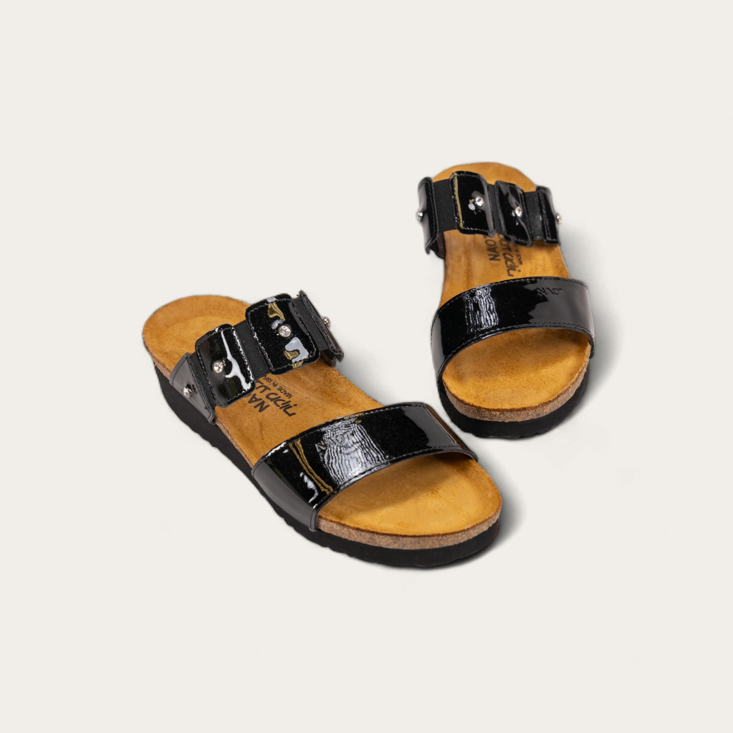 The Naot Ashley is a feminine slide sandal with rhinestone accents across the instep and gore for adjustability. Naot's anatomic cork and latex footbed is wrapped in a pampering suede and molds to the shape of the foot with wear. American Podiatric Medical Association (APMA) Accepted for promoting good foot health.