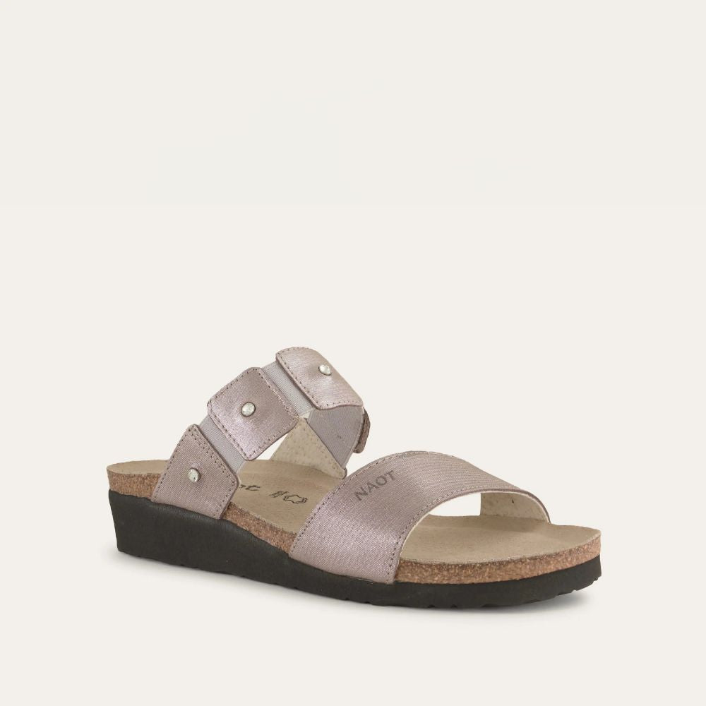 The Naot Ashley is a feminine slide sandal with rhinestone accents across the instep and gore for adjustability. Naot's anatomic cork and latex footbed is wrapped in a pampering suede and molds to the shape of the foot with wear. American Podiatric Medical Association (APMA) Accepted for promoting good foot health.