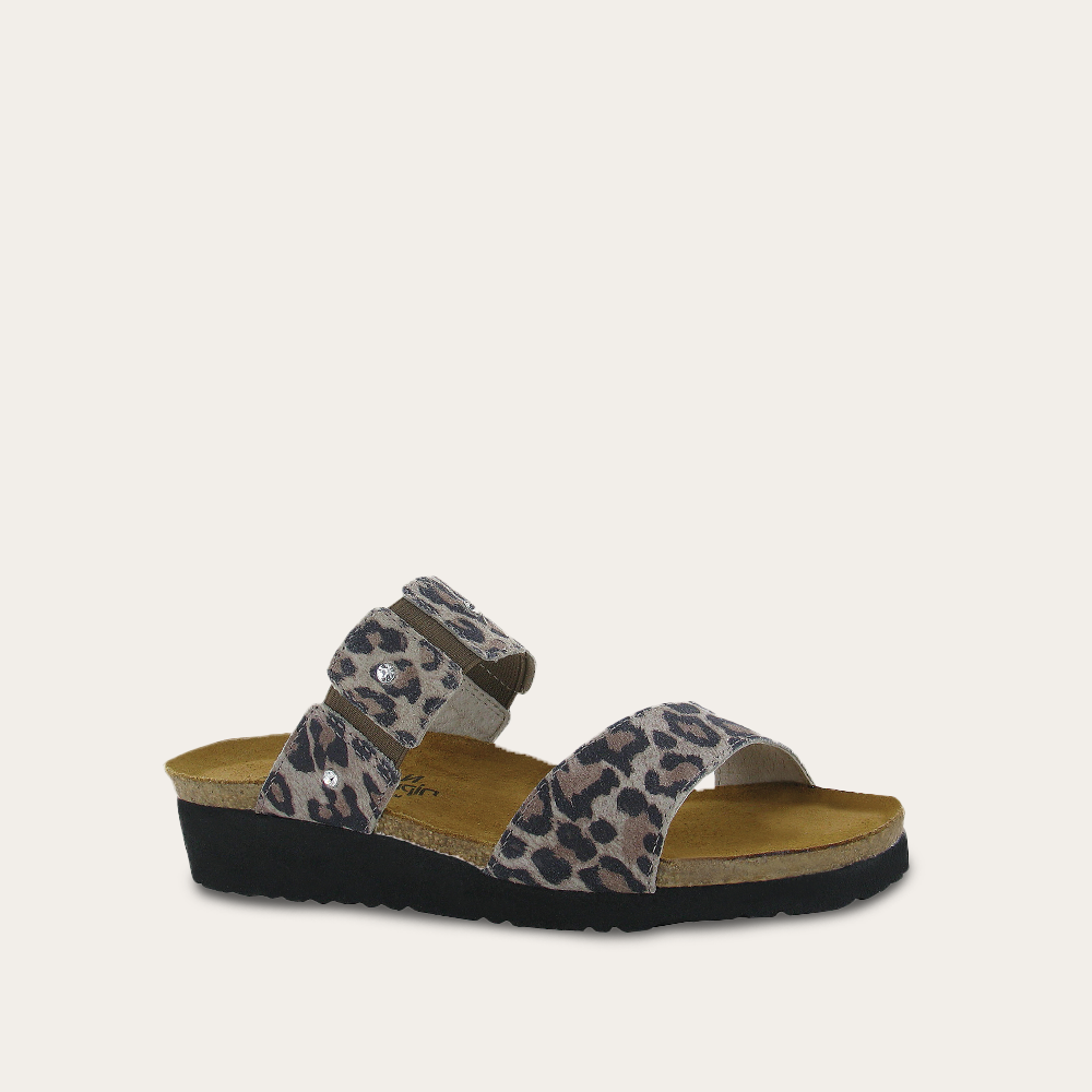 The Naot Ashley is a feminine slide sandal with rhinestone accents across the instep and gore for adjustability. Naot's anatomic cork and latex footbed is wrapped in a pampering suede and molds to the shape of the foot with wear. American Podiatric Medical Association (APMA) Accepted for promoting good foot health.