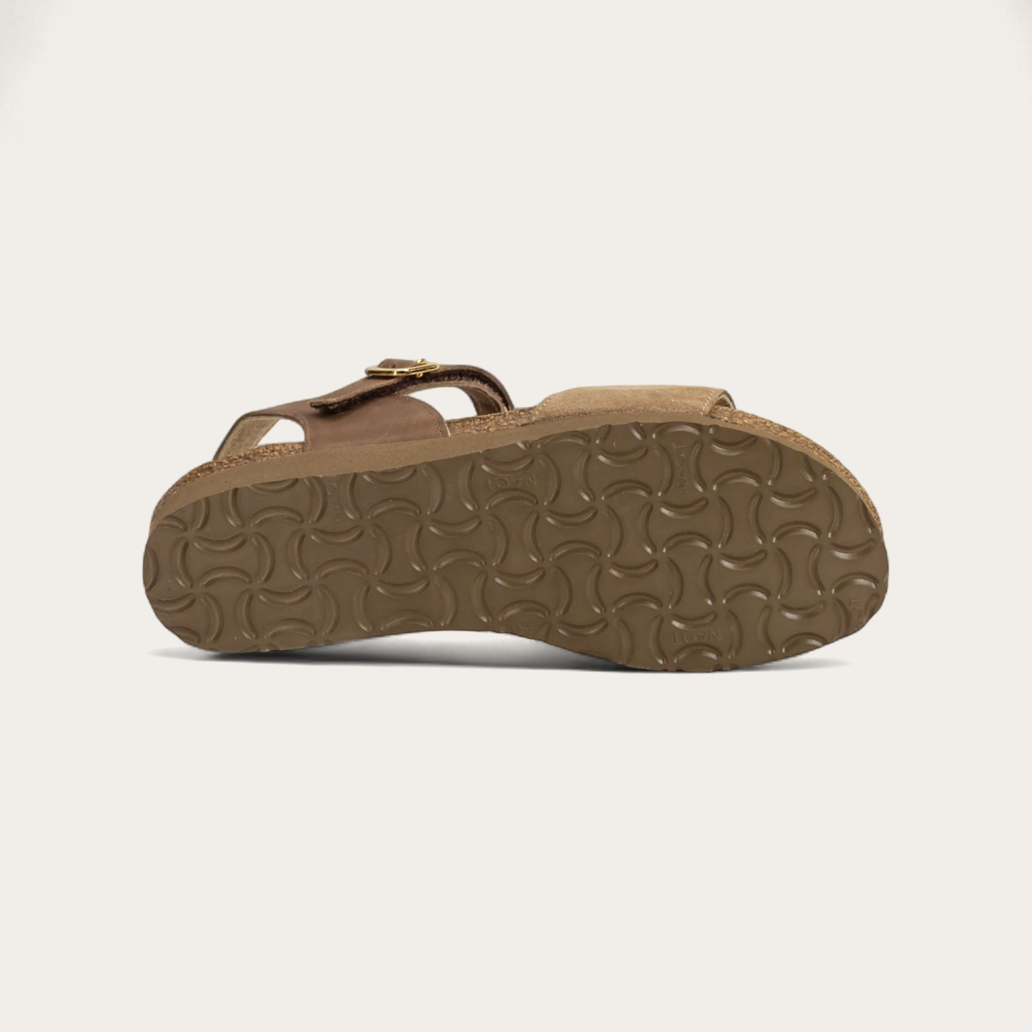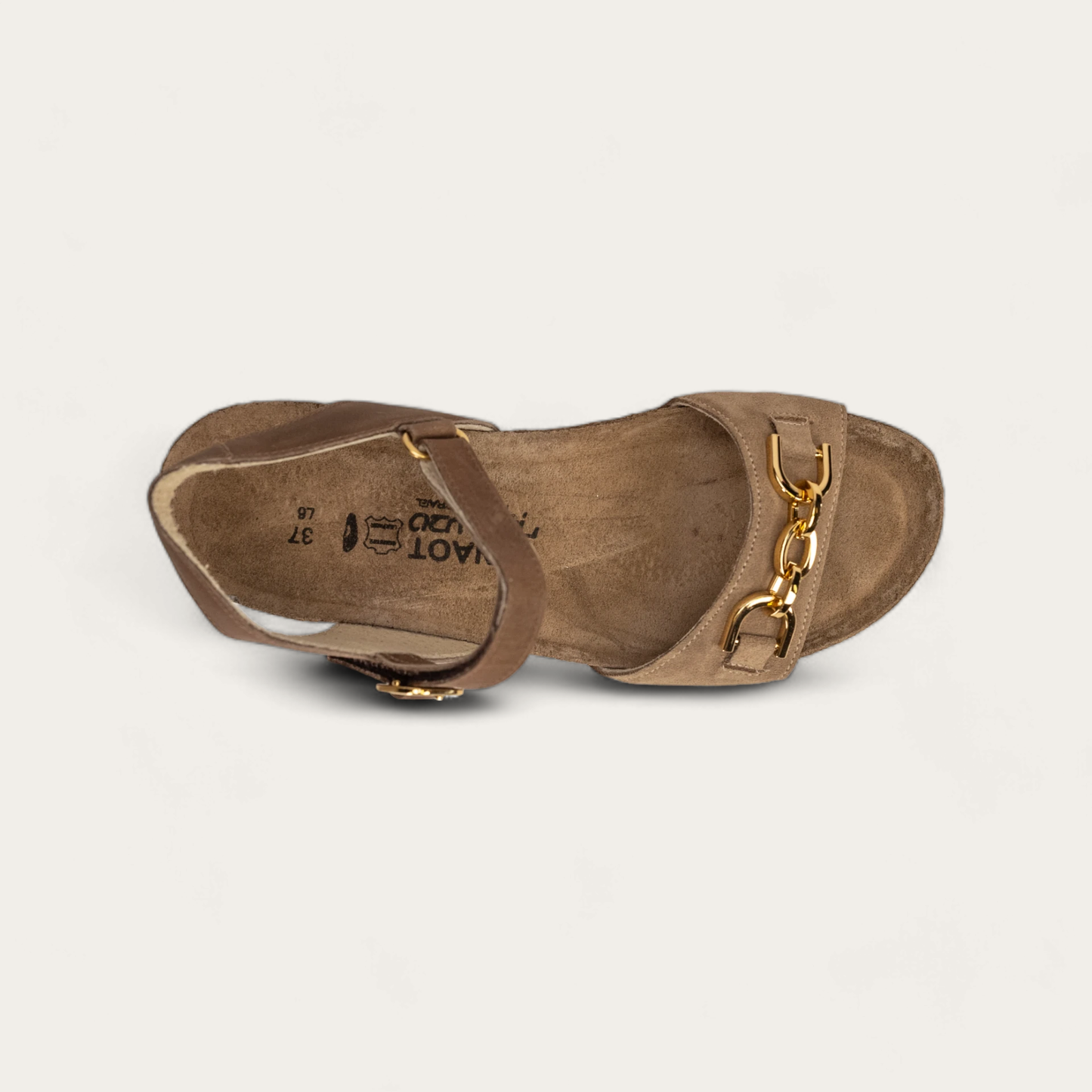 Naot Aubrey is an effortlessly elegant sandal with gold tone chain strap accent. The Aubrey features hook and loop strap at the instep and a backstrap with gore for stability and support. Naot's anatomic cork and latex footbed is wrapped in a pampering suede and molds to the shape of the foot with wear. American Podiatric Medical Association (APMA) Accepted for promoting good foot health.