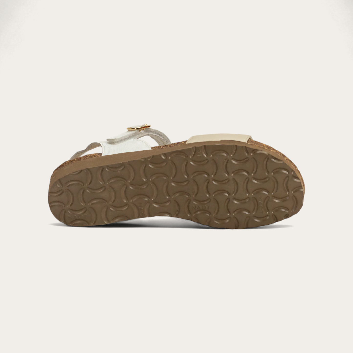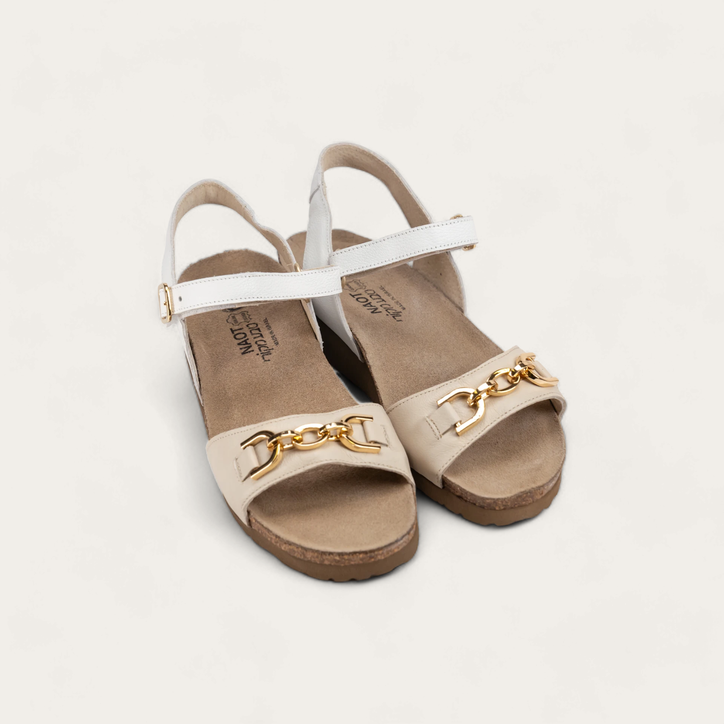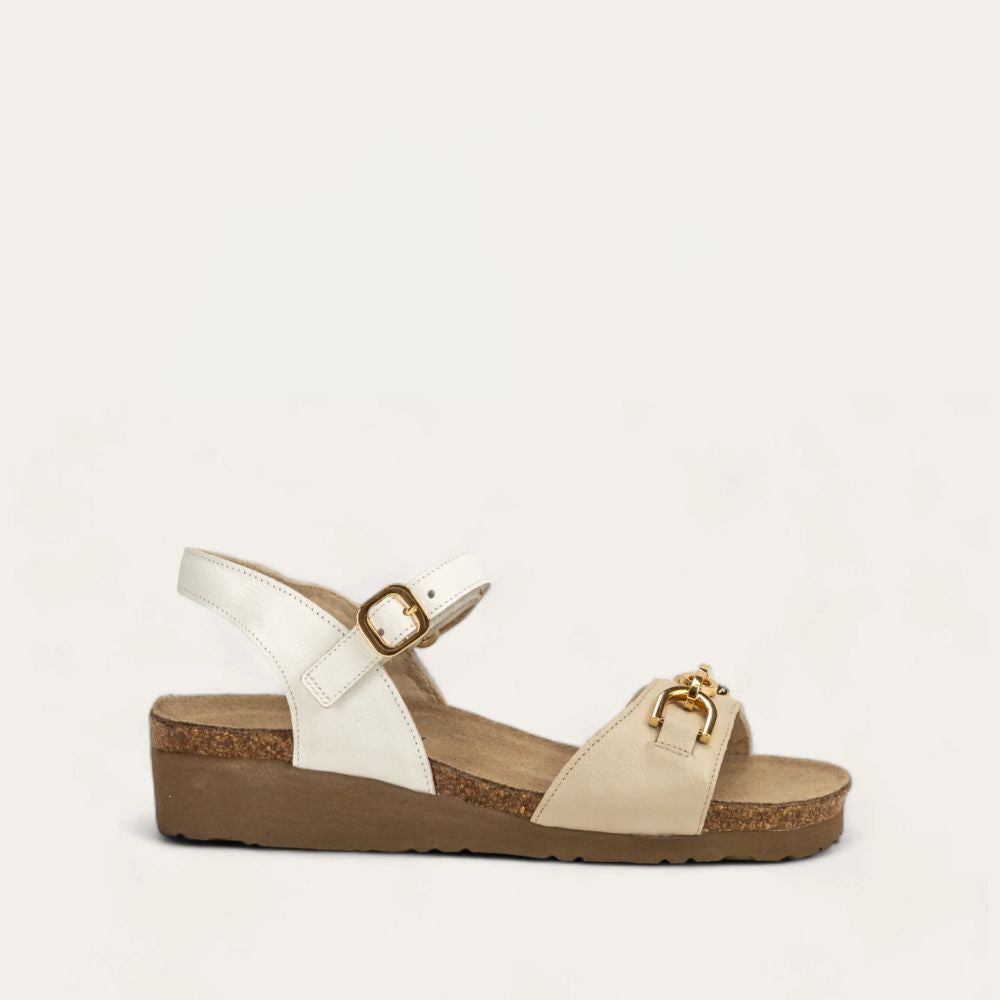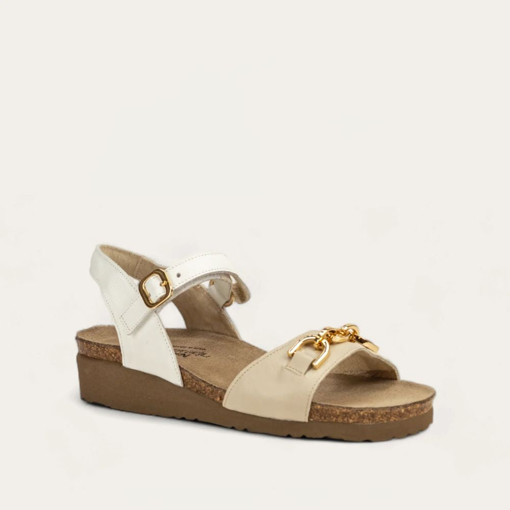 Naot Aubrey is an effortlessly elegant sandal with gold tone chain strap accent. The Aubrey features hook and loop strap at the instep and a backstrap with gore for stability and support. Naot's anatomic cork and latex footbed is wrapped in a pampering suede and molds to the shape of the foot with wear. American Podiatric Medical Association (APMA) Accepted for promoting good foot health.