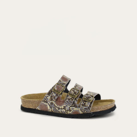 The Austin is a classic multi-strap slide. This sandal features three buckle closures for full adjustability. Naot's anatomic cork and latex footbed is wrapped in a pampering suede and molds to the shape of the foot with wear. The Classic Collection features a 1.25" EVA sole. American Podiatric Medical Association (APMA) Accepted for promoting good foot health.