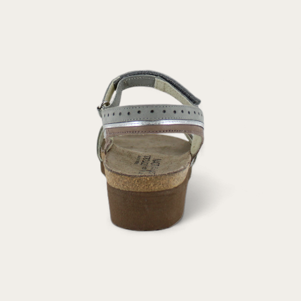 The Beverly is a colorful backstrap sandal that features unique cutouts and contrasting leathers. This style has a hook and loop closure at the instep for adjustability and padded front and back straps for added comfort. Naot's anatomic cork and latex footbed is wrapped in a pampering suede and molds to the shape of the foot with wear. American Podiatric Medical Association (APMA) Accepted for promoting good foot health.