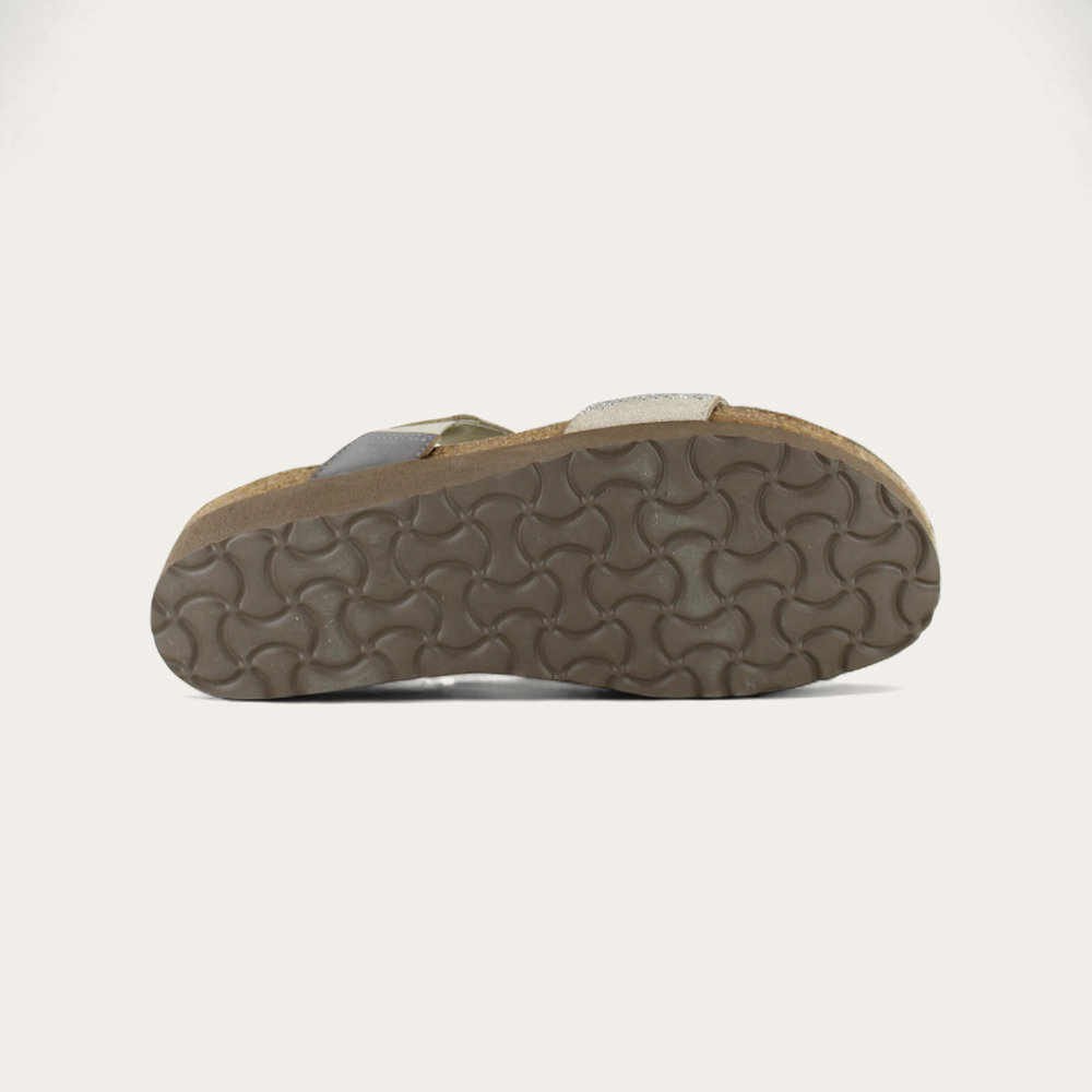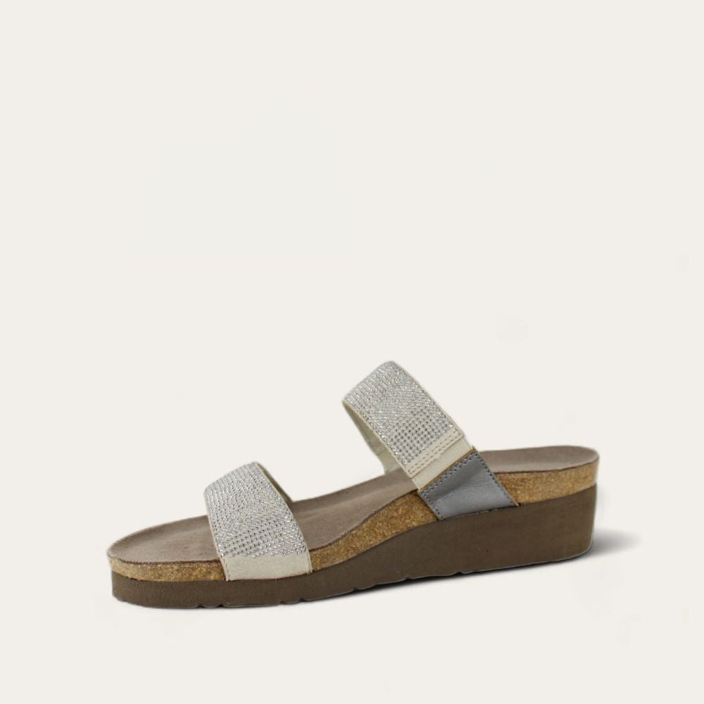 The Naot Bianca is a feminine slide sandal with rivet accents across the both the instep strap and the strap at the toes. This style also features gore at the instep for adjustability. Naot's anatomic cork and latex footbed is wrapped in a pampering suede and molds to the shape of the foot with wear. American Podiatric Medical Association (APMA) Accepted for promoting good foot health.