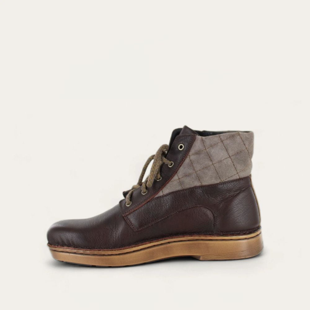 The Castera is a comfy everyday bootie made with soft leather combinations, zipper accent, lace up closure and quilted details. Naot Castera features Naot's anatomic cork and latex footbed is wrapped in a pampering suede and molds to the shape of the foot with wear. American Podiatric Medical Association (APMA) Accepted for promoting good foot health. Castera fits our Utopia Footbed.