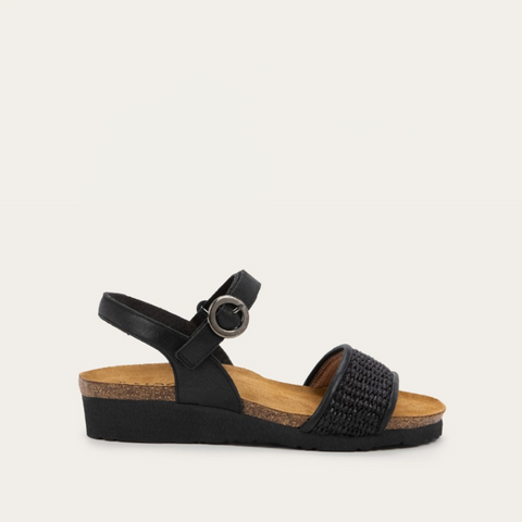 Meet Cecile - the perfect harmony of comfort and elegance. This backstrap sandal boasts a chic design with a faux buckle hook and loop strap and raffia detailing on the front strap, adding a touch of natural charm to any ensemble.