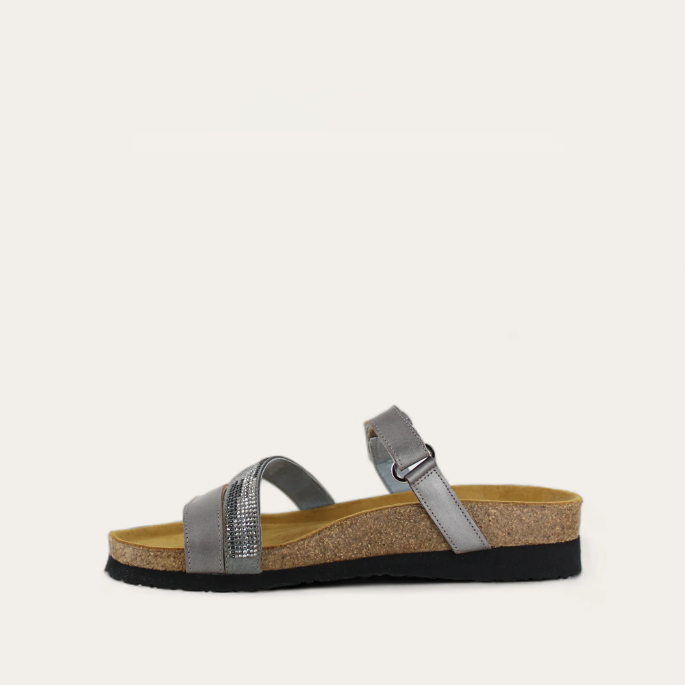 The Columbus slide sandal features a beautiful array of rivet accents and contains a hook and loop closure at the instep. Naot's anatomic cork and latex footbed is wrapped in a pampering suede and molds to the shape of the foot with wear. The Classic Collection features a 1.25" EVA sole.