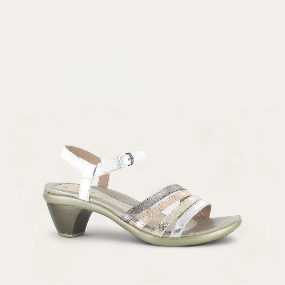 Delicate and strappy, Naot Current is a must-have minimalist evening sandal. This style features a supportive backstrap and a buckle closure that allows adjustability. Naot's anatomic cork and latex footbed is wrapped in leather with a microfiber center to prevent slipping and molds to the shape of the foot with wear. The Avantgarde Collection features a TPR sole with a metal shank. This sole offers the look of a 2" heel without the feel.