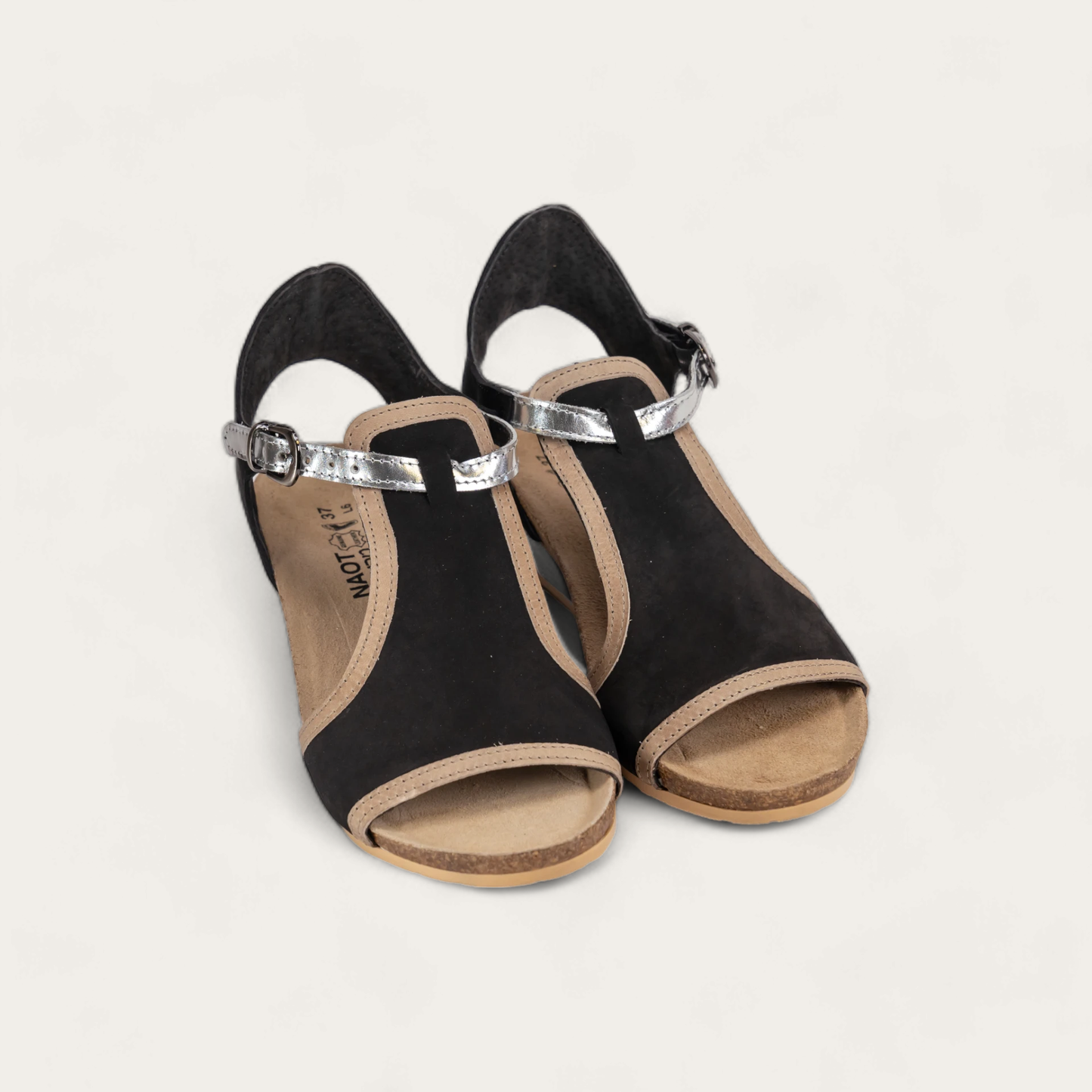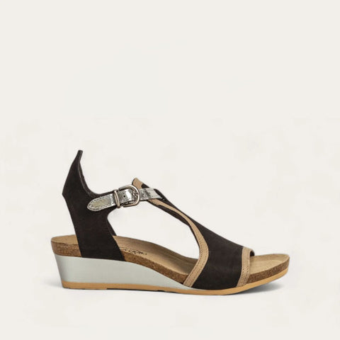 The Fiona is the perfect transitional wedge. This style features a full coverage upper with a contrasting trim. A functioning buckles creates accessibility while the padded heel cup provides comfort. Naot's anatomic cork and latex footbed is wrapped in a pampering suede and molds to the shape of the foot with wear.