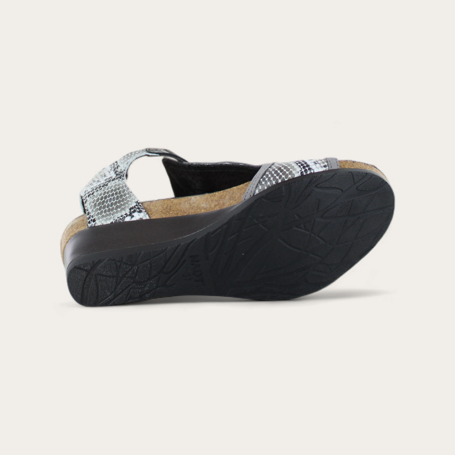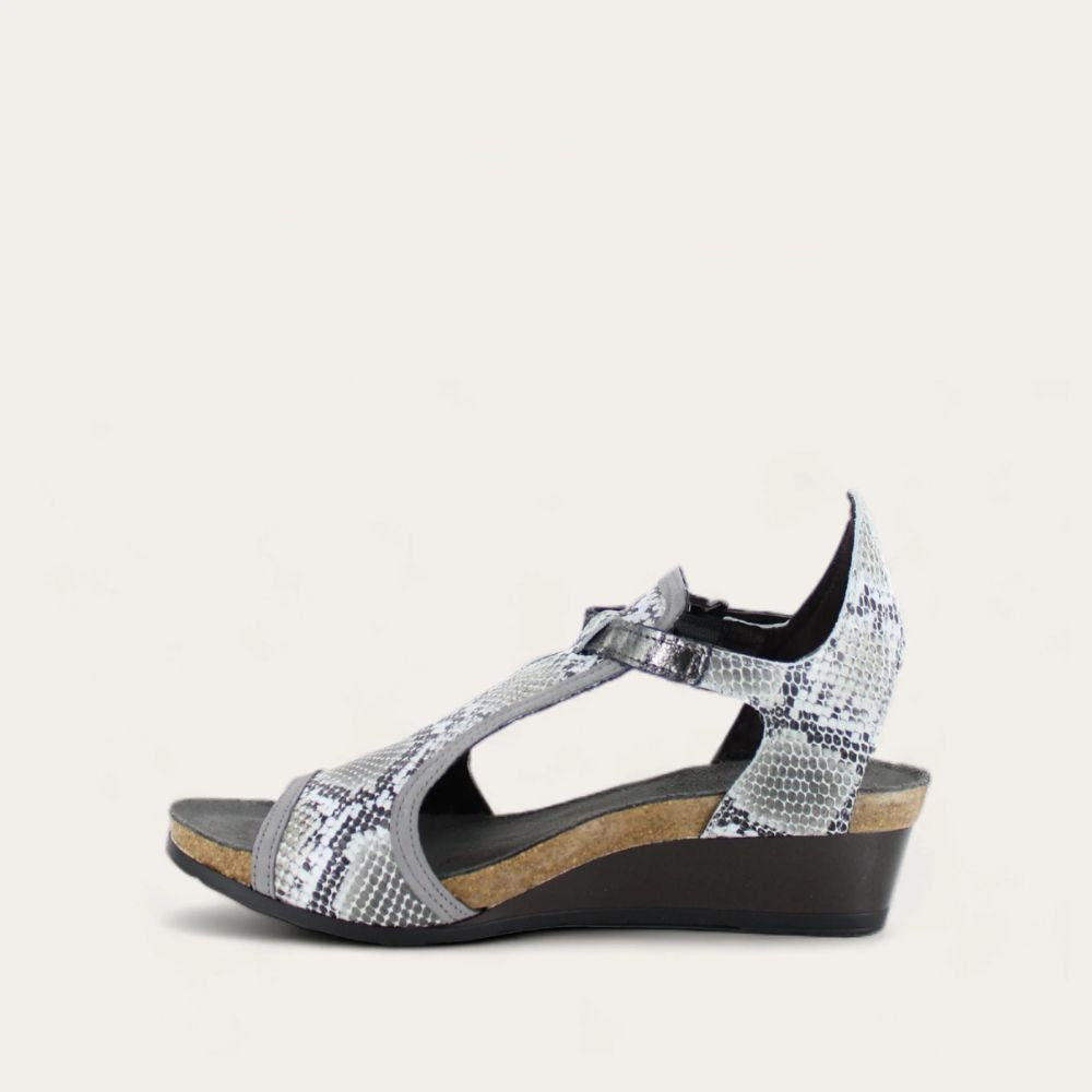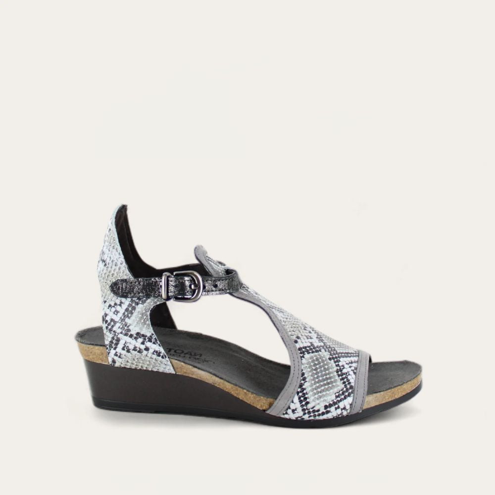 The Fiona is the perfect transitional wedge. This style features a full coverage upper with a contrasting trim. A functioning buckles creates accessibility while the padded heel cup provides comfort. Naot's anatomic cork and latex footbed is wrapped in a pampering suede and molds to the shape of the foot with wear.