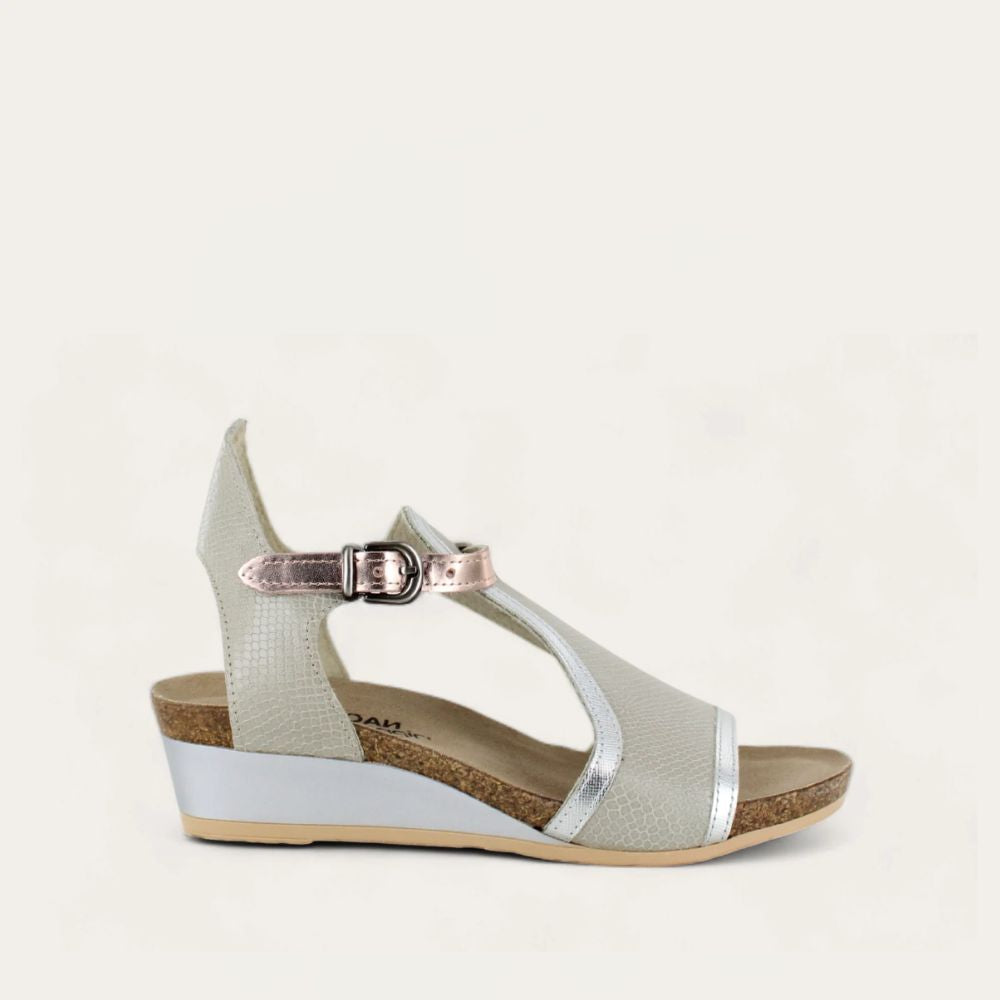 The Fiona is the perfect transitional wedge. This style features a full coverage upper with a contrasting trim. A functioning buckles creates accessibility while the padded heel cup provides comfort. Naot's anatomic cork and latex footbed is wrapped in a pampering suede and molds to the shape of the foot with wear.