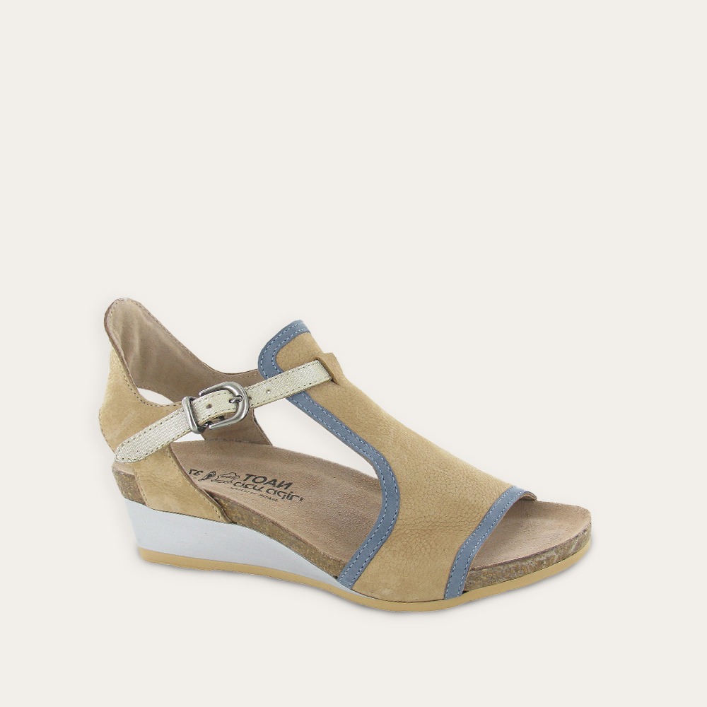 The Fiona is the perfect transitional wedge. This style features a full coverage upper with a contrasting trim. A functioning buckles creates accessibility while the padded heel cup provides comfort. Naot's anatomic cork and latex footbed is wrapped in a pampering suede and molds to the shape of the foot with wear.