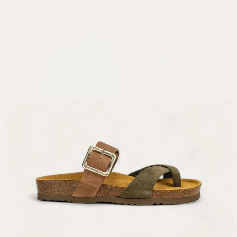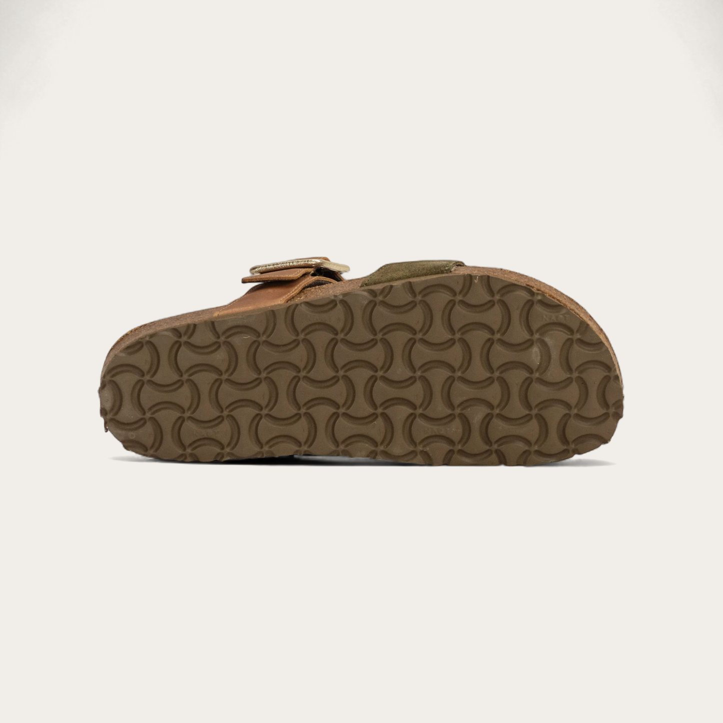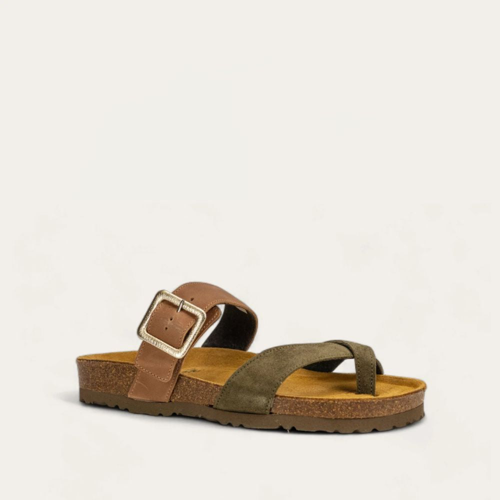 The Naot Fresno is a toe loop slide sandal featuring a contrast of leather and suede straps. With an oversized buckle that makes a statement, the Fresno also has hidden gore attached to the buckle for extra adjustability. Naot's anatomic cork and latex footbed is wrapped in a pampering suede and molds to the shape of the foot with wear. The Classic Collection features a 1.25" EVA sole. American Podiatric Medical Association (APMA) Accepted for promoting good foot health.