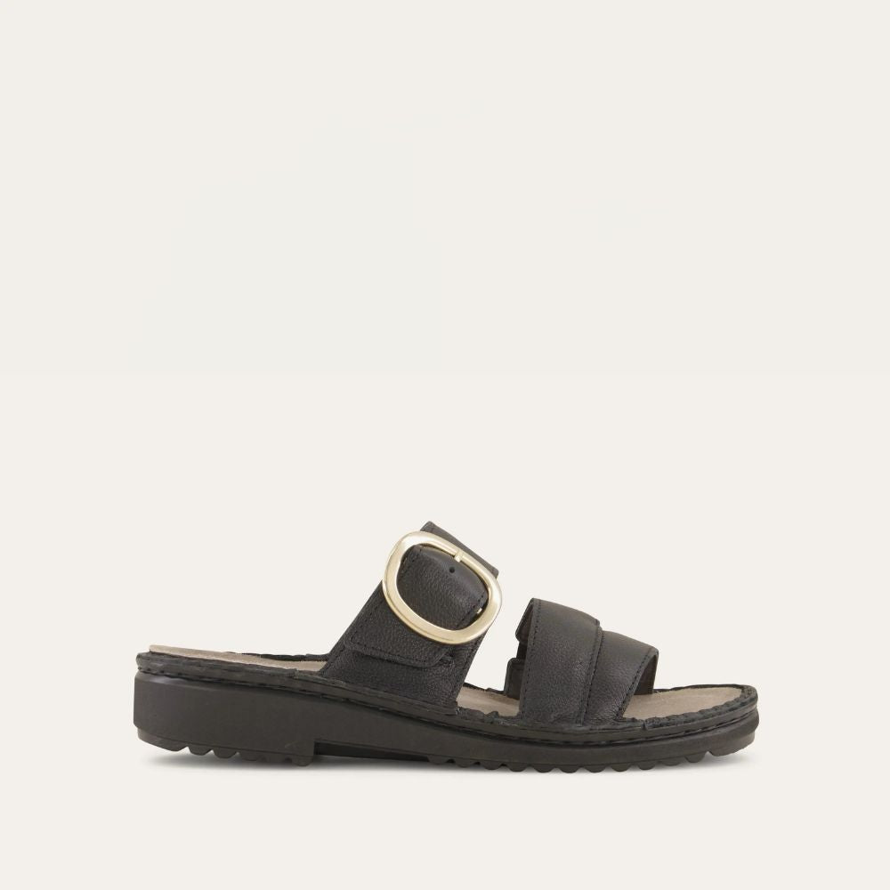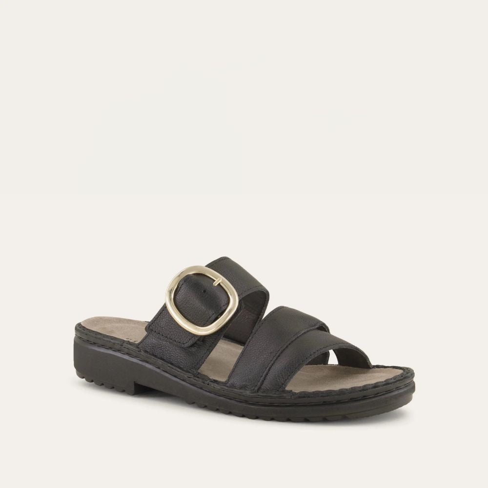 Frey is a stylish slip-on sandal with a buckle accent featuring our removable footbed for comfort. Naot's removable, anatomic cork and latex footbed is wrapped in pampering suede and molds to the shape of the foot with wear. The Low Scandinavian Collection features a 1.25" polyurethane sole which is extremely lightweight and durable. American Podiatric Medical Association (APMA) Accepted for promoting good foot health. Our patented Naot Replacement Footbeds are also available for Frey.