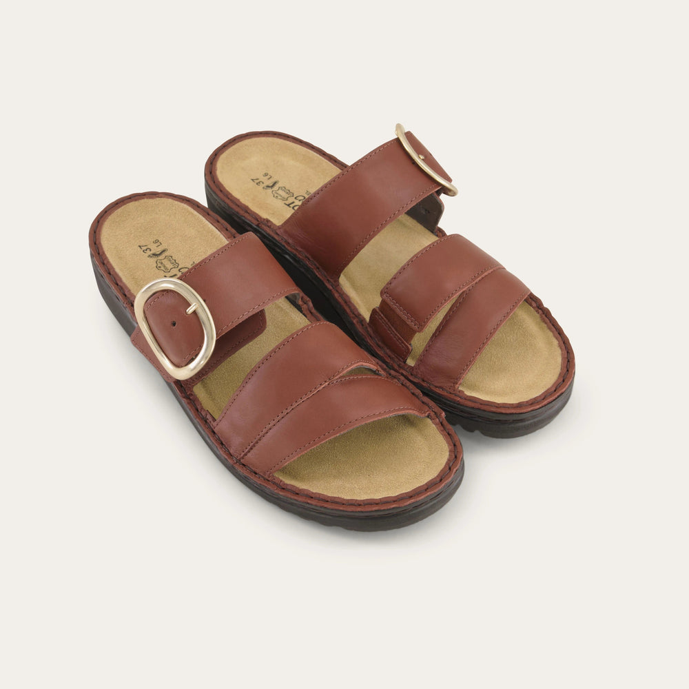 Frey is a stylish slip-on sandal with a buckle accent featuring our removable footbed for comfort. Naot's removable, anatomic cork and latex footbed is wrapped in pampering suede and molds to the shape of the foot with wear. The Low Scandinavian Collection features a 1.25" polyurethane sole which is extremely lightweight and durable. American Podiatric Medical Association (APMA) Accepted for promoting good foot health. Our patented Naot Replacement Footbeds are also available for Frey.