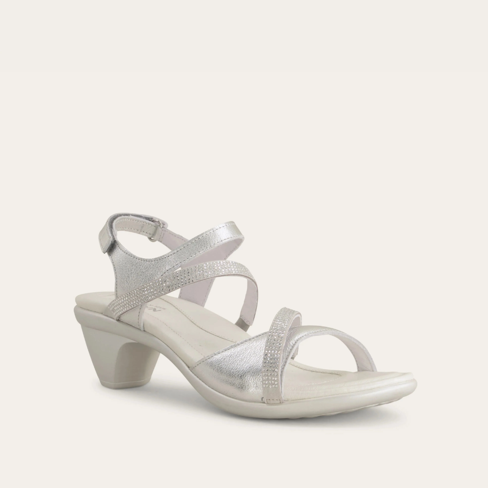 The Innovate is the perfect backstrap heel for all of your festive events! This sandal has a hook and loop backstrap and gore at the middle straps creating a custom fit. The Innovate has a padded front strap for ultimate comfort. The feminine rhinestone accents make this shoe stand out from the crowd. Naot's anatomic cork and latex footbed is wrapped in leather with a microfiber center to prevent slipping and molds to the shape of the foot with wear. The Avantgarde Collection features a TPR sole with a metal shank. This sole offers the look of a 2" heel without the feel.