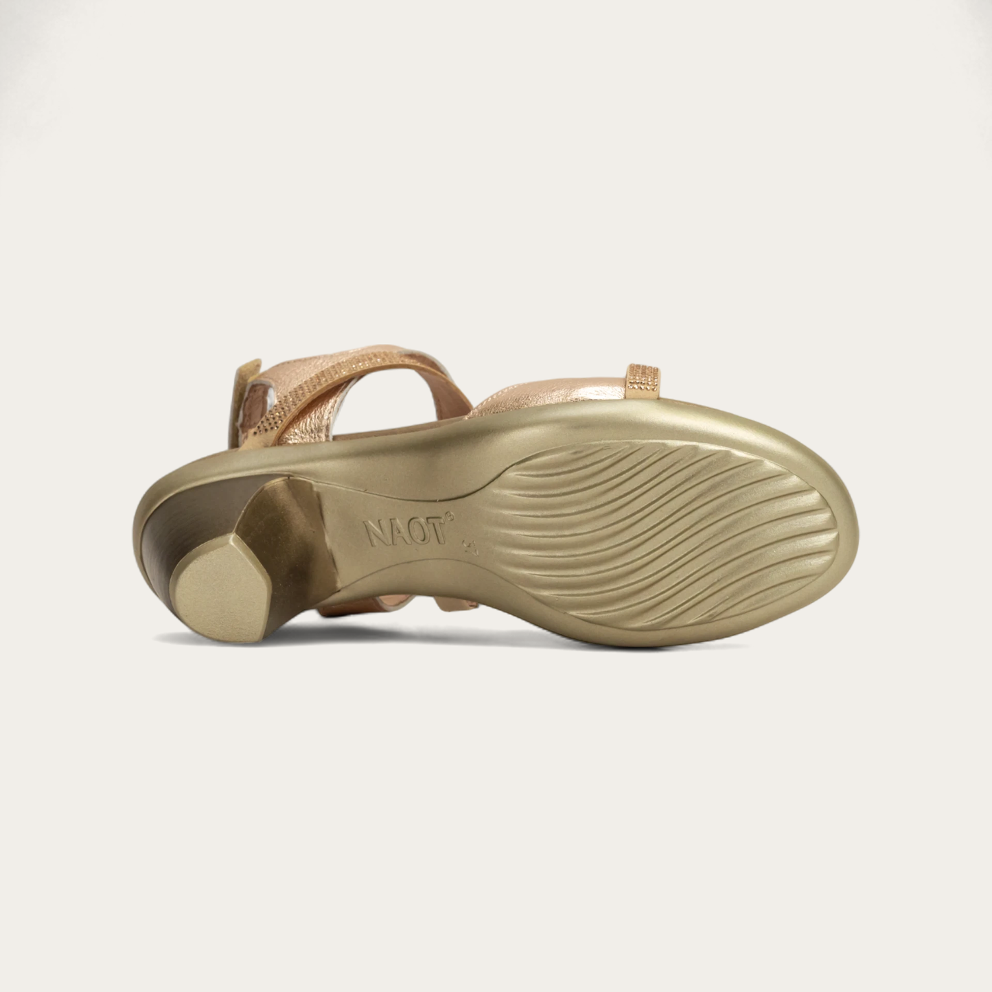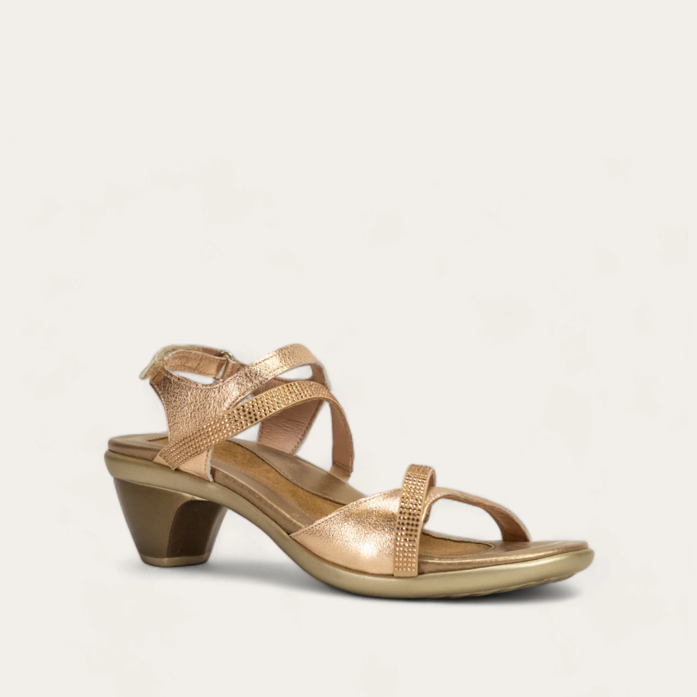The Innovate is the perfect backstrap heel for all of your festive events! This sandal has a hook and loop backstrap and gore at the middle straps creating a custom fit. The Innovate has a padded front strap for ultimate comfort. The feminine rhinestone accents make this shoe stand out from the crowd. Naot's anatomic cork and latex footbed is wrapped in leather with a microfiber center to prevent slipping and molds to the shape of the foot with wear. The Avantgarde Collection features a TPR sole with a metal shank. This sole offers the look of a 2" heel without the feel.