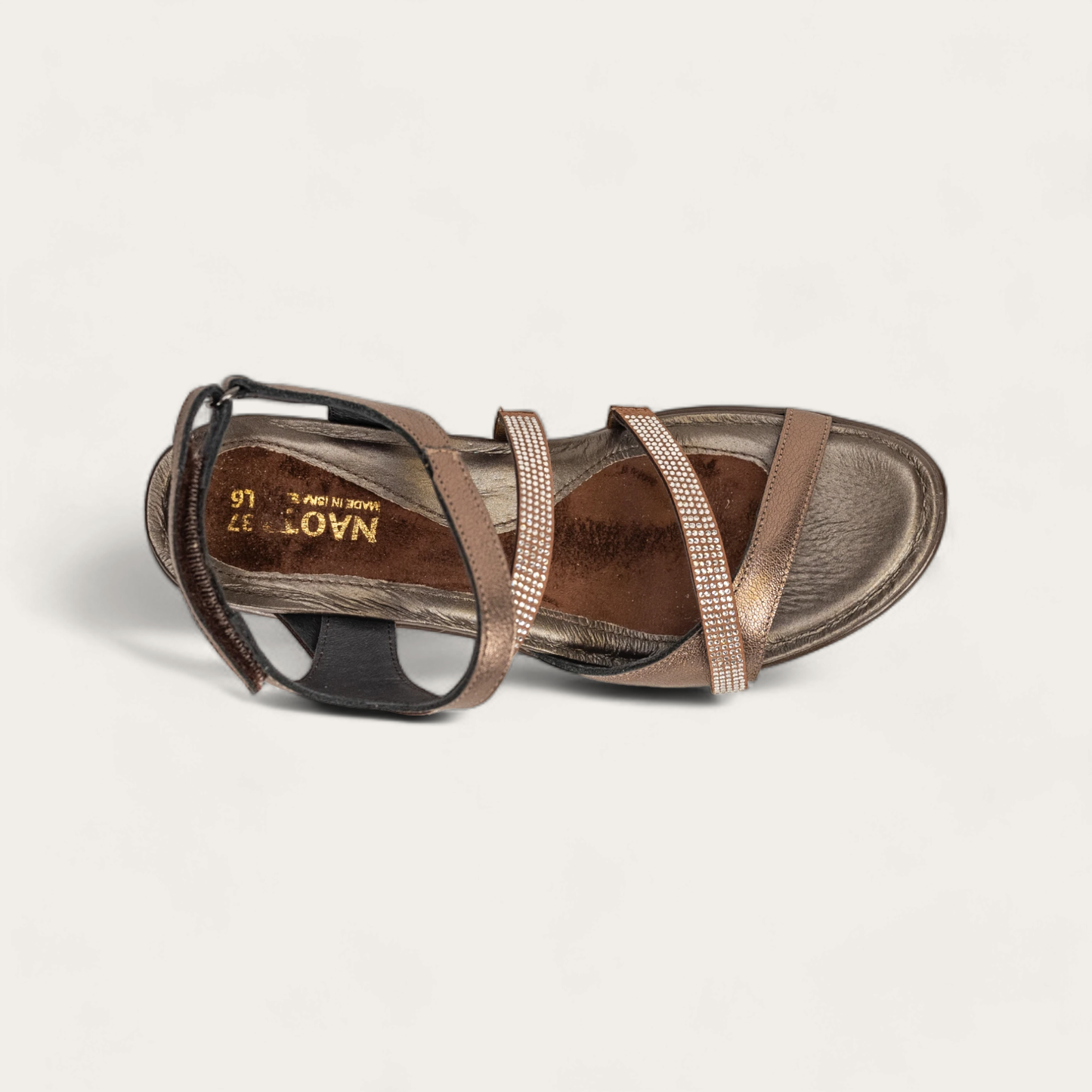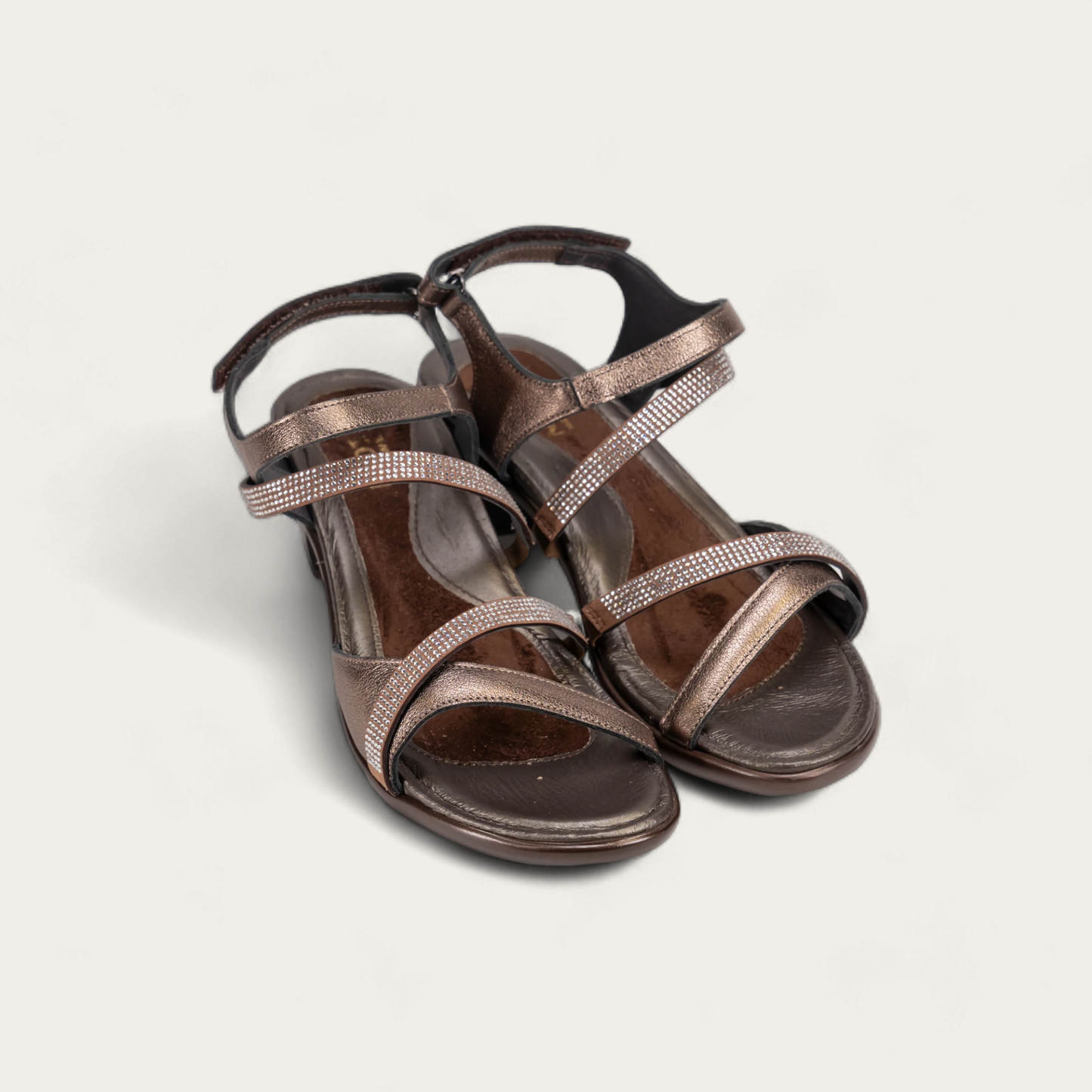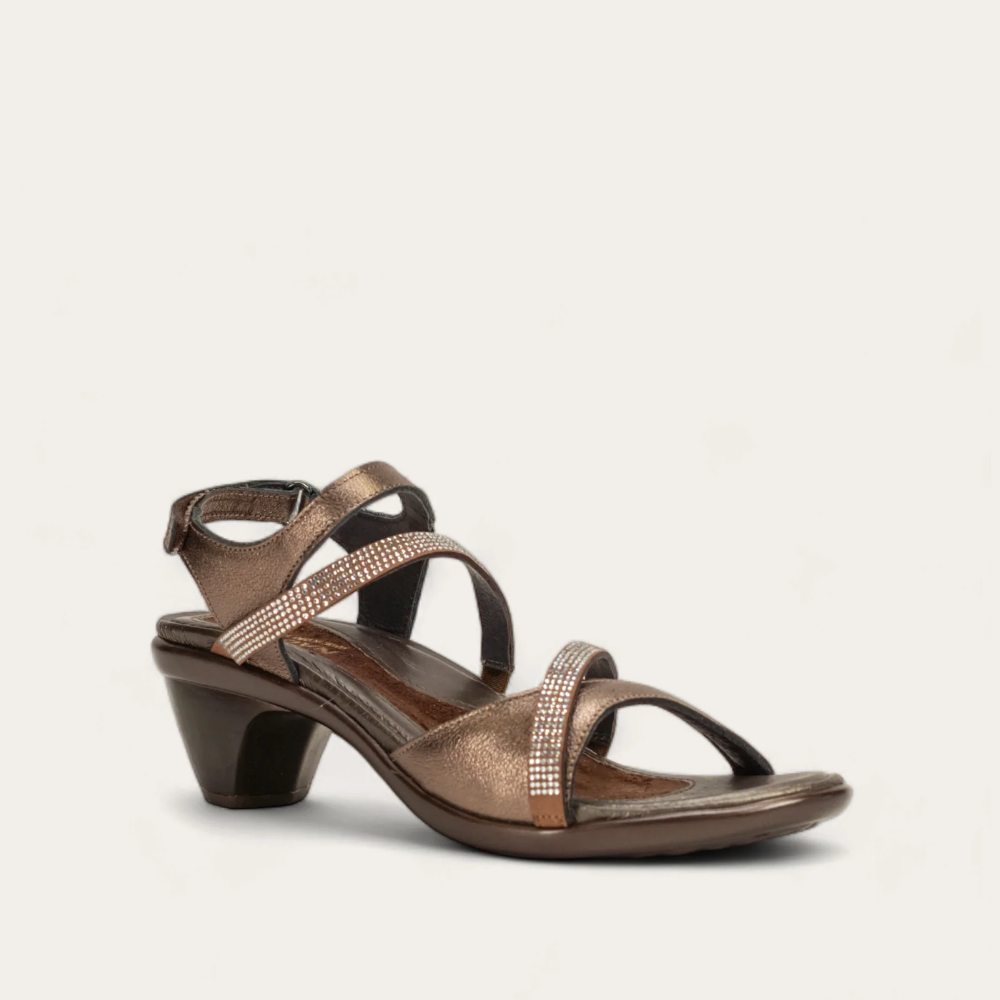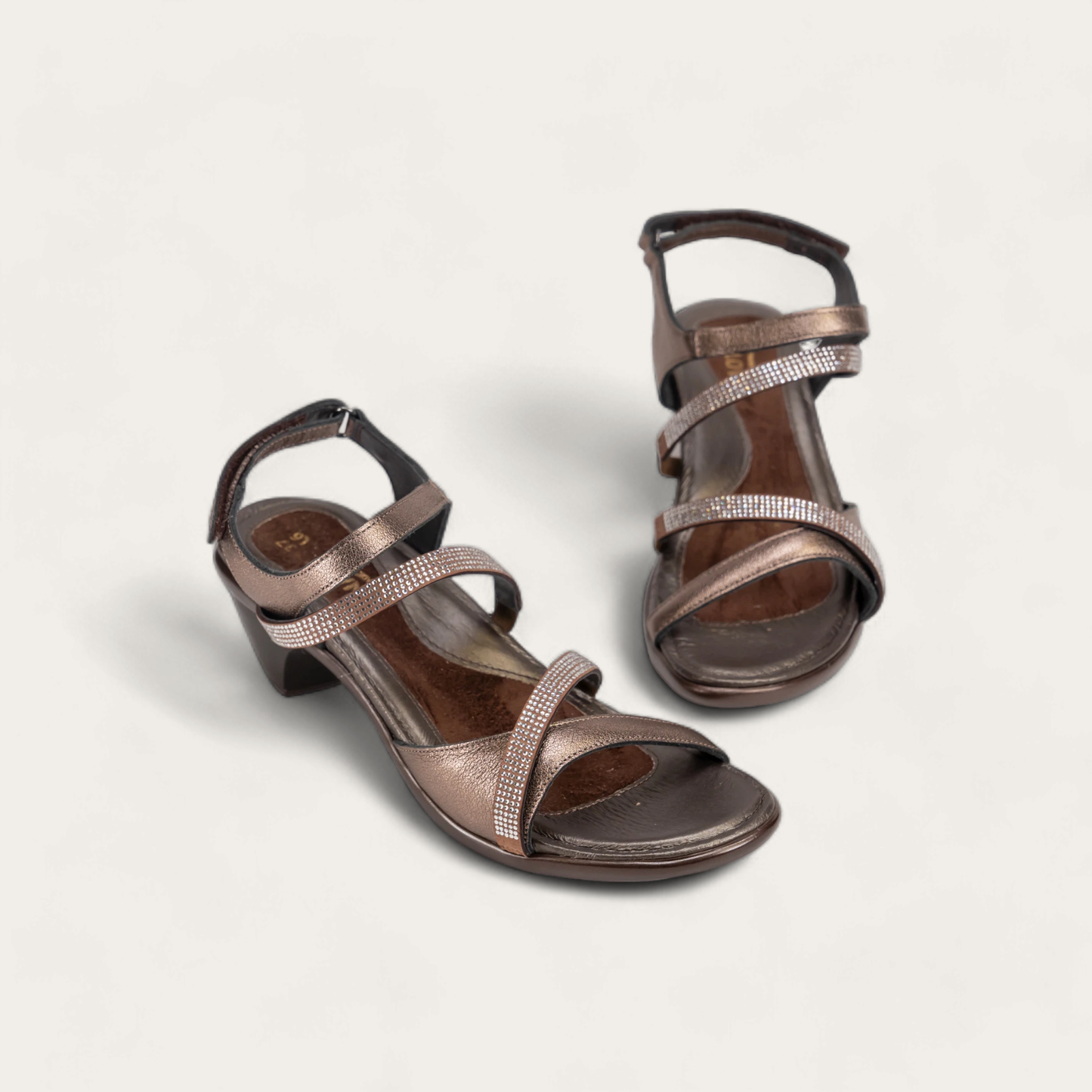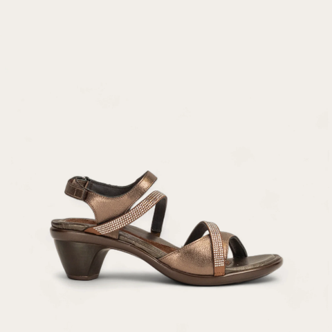The Innovate is the perfect backstrap heel for all of your festive events! This sandal has a hook and loop backstrap and gore at the middle straps creating a custom fit. The Innovate has a padded front strap for ultimate comfort. The feminine rhinestone accents make this shoe stand out from the crowd. Naot's anatomic cork and latex footbed is wrapped in leather with a microfiber center to prevent slipping and molds to the shape of the foot with wear. The Avantgarde Collection features a TPR sole with a metal shank. This sole offers the look of a 2" heel without the feel.