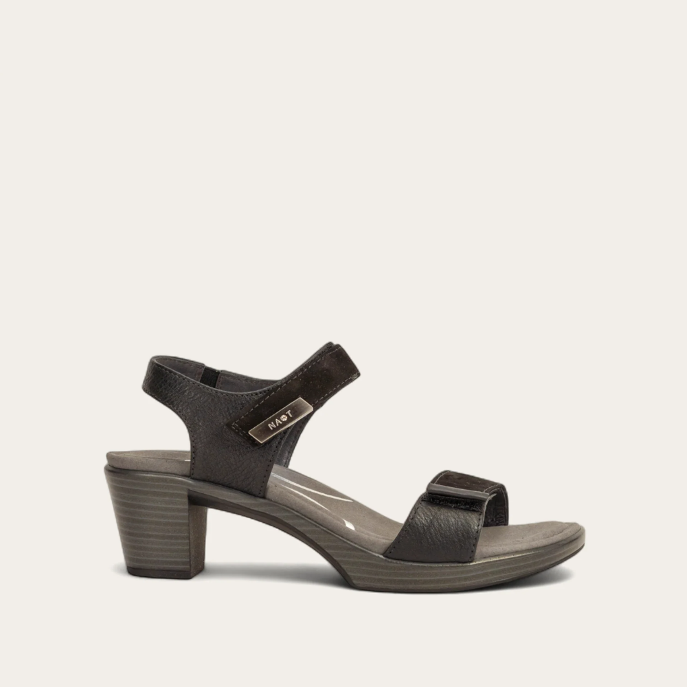 The Intact is a fashionable heel that features double hook and loop straps for complete adjustability. The Intact provides a dressier look. Naot's anatomic cork and latex footbed is wrapped in pampering suede and molds to the shape of the foot with wear. The Supreme Collection features a metal shank and provides the look of a 2.25" heel without the feel.