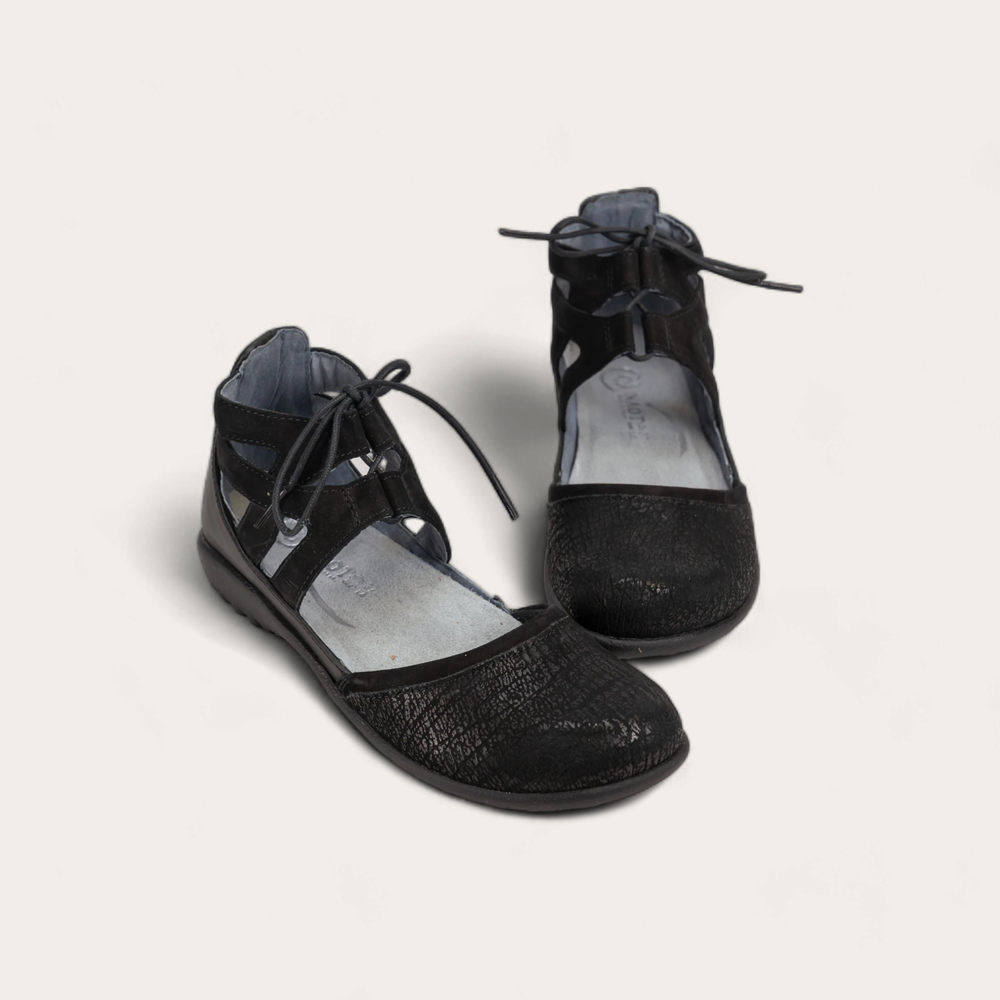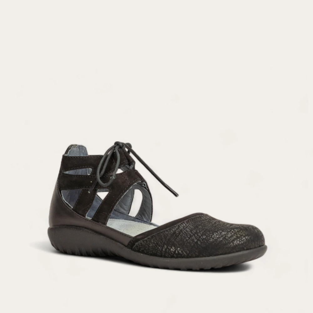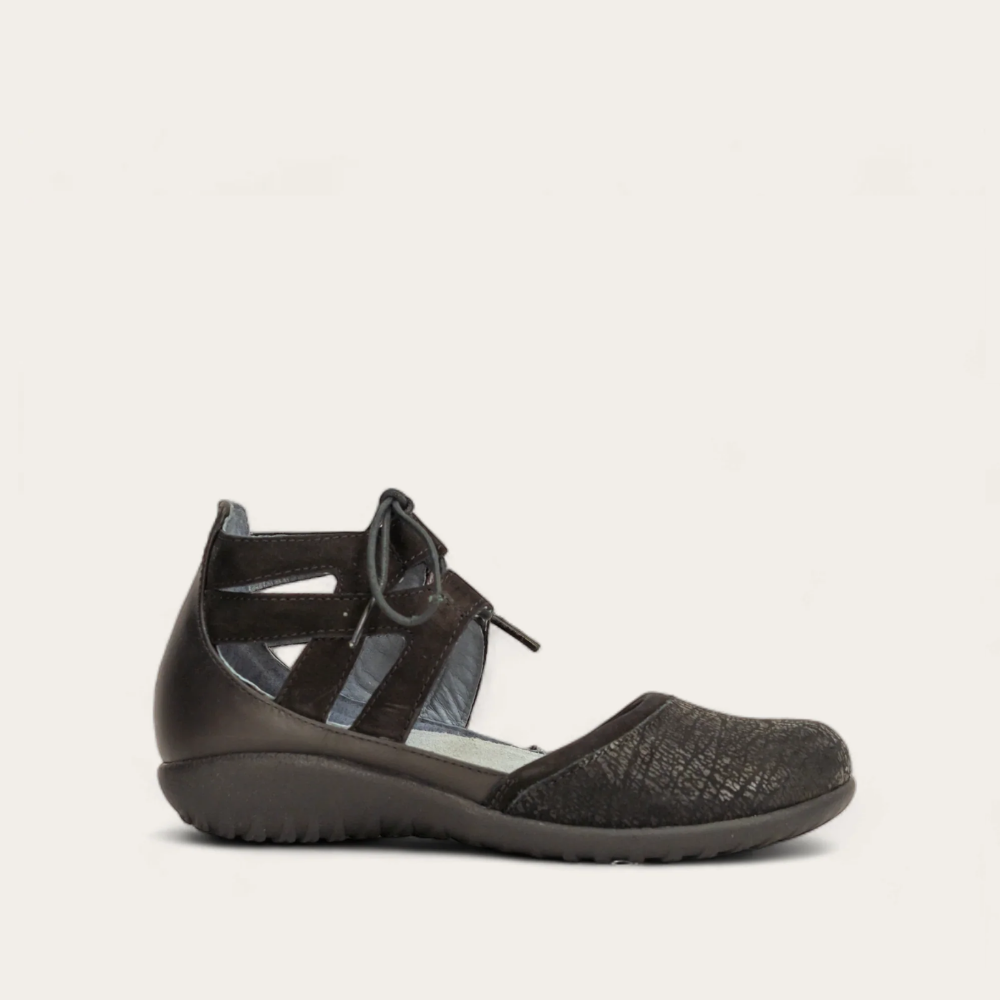 The Kata is a cute transitional shoe. This style has a padded heel cup and instep for ultimate comfort. The Kata has laces at the instep for accessibility and adjustability. The front of this shoe has padded technical lining which provides comfort, warmth and moisture absorption. Naot's removable, anatomic cork and latex footbed is wrapped in pampering suede and molds to the shape of the foot with wear. The Koru Collection features a 1" polyurethane sole which is extremely lightweight, durable and slip resistant. This collection uses a hand-sewn Strobel construction making it strong and extremely flexible. American Podiatric Medical Association (APMA) Accepted for promoting good foot health. Our patented Naot Replacement Footbeds are also available for Kata.