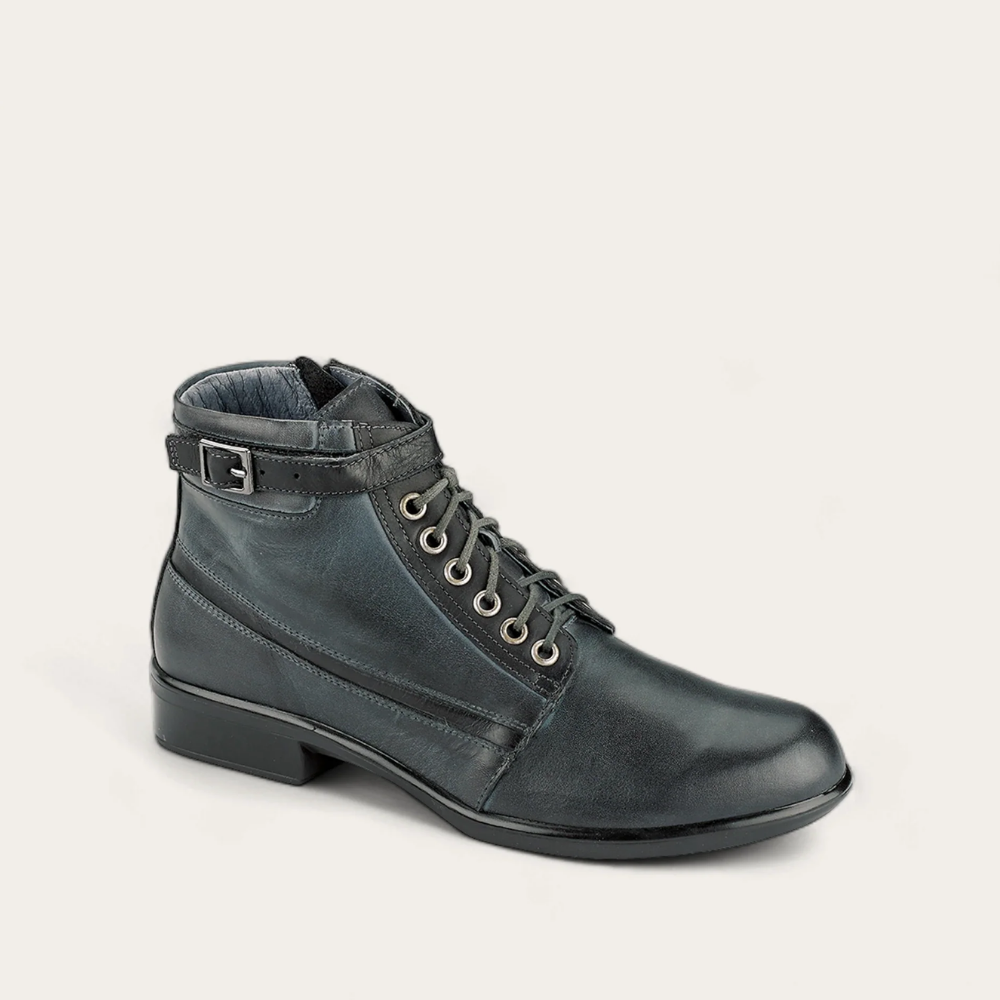The Naot Kona is fashionable boot that provides a sleek and dressy look. This style features a hook and loop faux buckle as well as a zipper. This boot has padded technical lining for comfort, warmth and moisture absorption. Naot's removable, anatomic cork and latex footbed is wrapped in microfiber and leather and molds to the shape of the foot with wear. The Aura Collection features a 1.5" polyurethane sole with a metal shank which is extremely lightweight, durable and abrasive to prevent slipping. This collection uses a hand-sewn Strobel construction making it strong and extremely flexible. Our patented Naot Replacement Footbeds are also available for Kona.