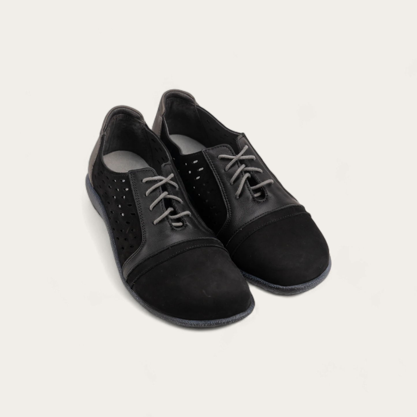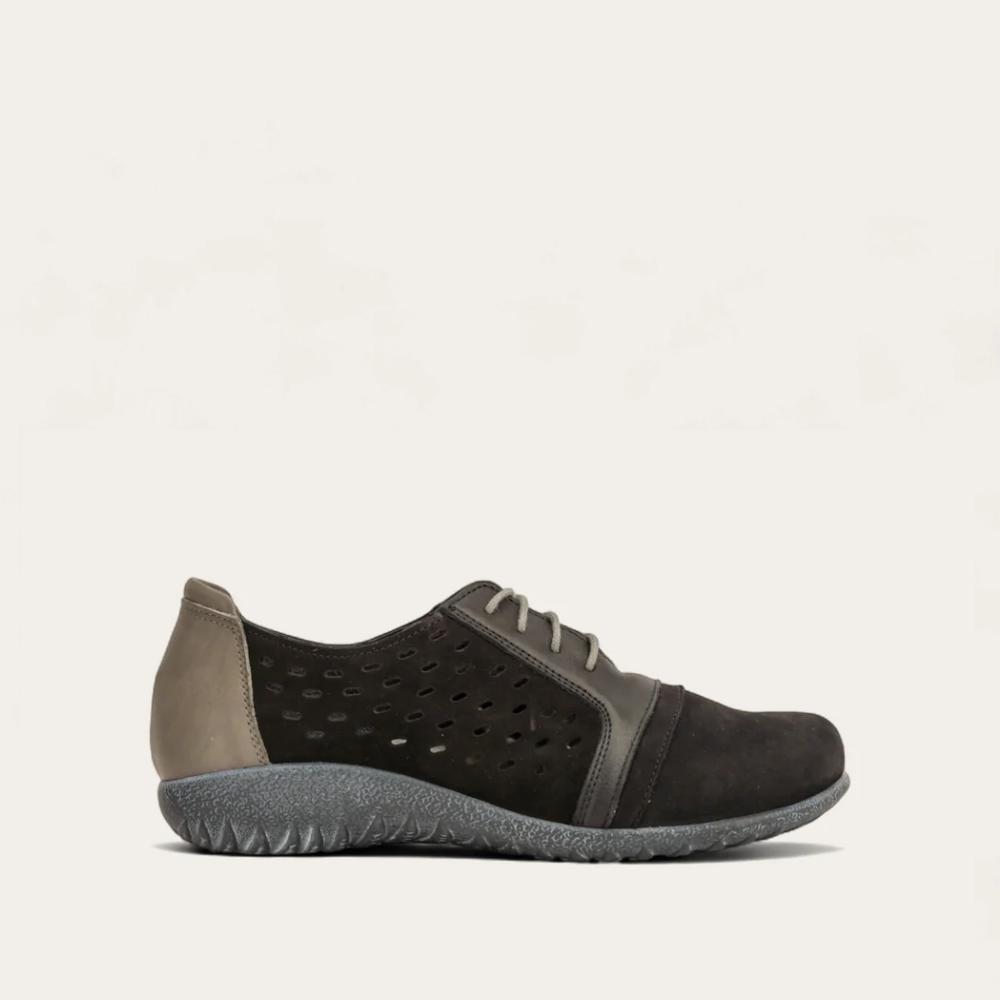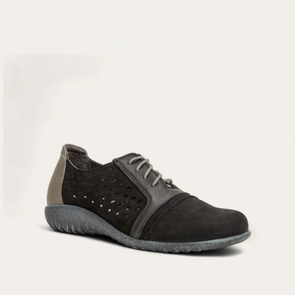 The Lalo is a versatile and classic shoe. Its laces, cutouts, and multitude of materials make it stand out as a go-to choice for everyday fall wear. The Lalo is built with Naot's removable, anatomic cork and latex footbed, which is wrapped in pampering suede and molds to the shape of the foot with wear. The Koru Collection features a 1" polyurethane sole which is extremely lightweight, durable and slip resistant. This collection uses a hand-sewn Strobel construction making it strong and extremely flexible. American Podiatric Medical Association (APMA) Accepted for promoting good foot health. Our patented Naot Replacement Footbeds are also available for Lalo.