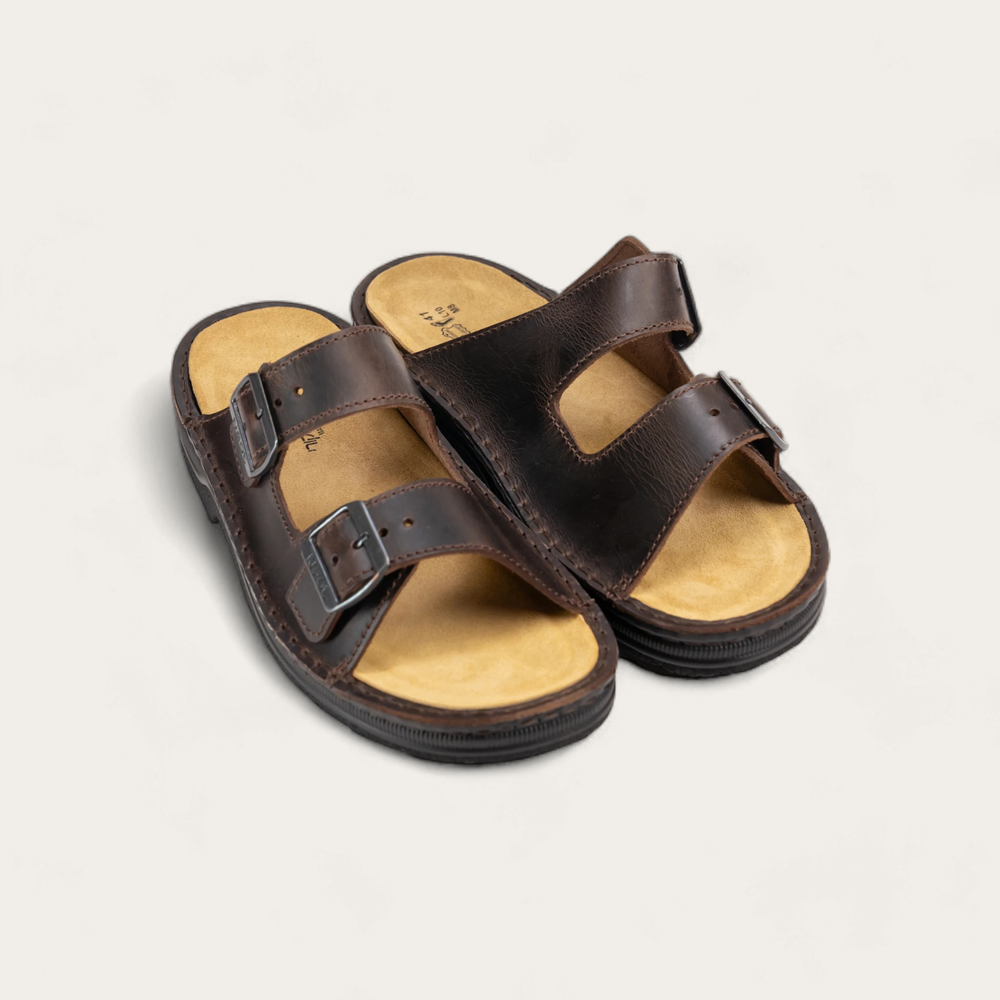 The Mikael is a completely adjustable slide sandal with two buckle straps. The side panels on this style provide extra support. Naot's removable, anatomic cork and latex footbed is wrapped in pampering suede and molds to the shape of the foot with wear. The Men's Scandinavian Collection features a 1.5" polyurethane sole which is extremely lightweight, durable and slip resistant. American Podiatric Medical Association (APMA) Accepted for promoting good foot health. Our patented Naot Replacement Footbeds are also available for Mikael.