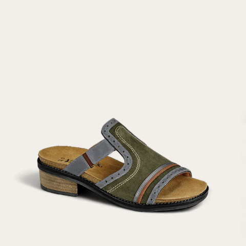 The Nifty is a unique sandal with mixed materials, colors rivet accents. Double gore at the instep creates adjustability and a padded upper provides comfort. Naot's anatomic cork and latex footbed is wrapped in a pampering suede and molds to the shape of the foot with wear.