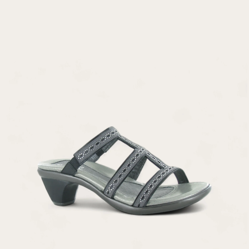 Meet the Novel, a dressy slide sandal that offers style and comfort. The Novel has double gore for ease of wear and beautiful stone accents. Naot's anatomic cork and latex footbed is wrapped in leather with a microfiber center to prevent slipping and molds to the shape of the foot with wear. The Avantgarde Collection features a TPR sole with a metal shank. This sole offers the look of a 2" heel without the feel.