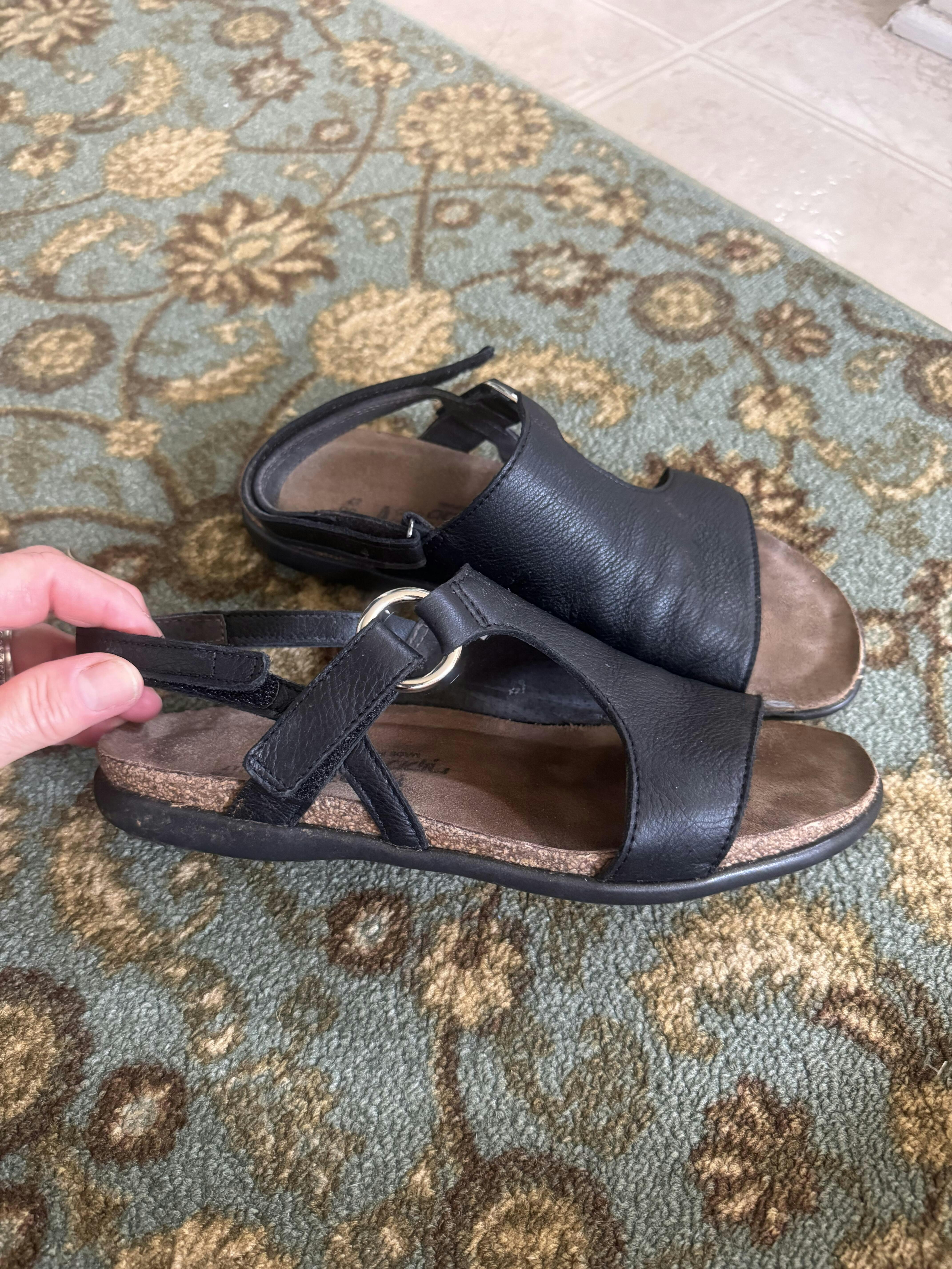 The Olivia sandal is an everyday effortless style. Featuring a hook and loop ankle strap for adjustability. Naot's anatomic cork and latex footbed is wrapped in a pampering suede and molds to the shape of the foot with wear. The Flat Elegant Collection features a .75" TPR sole.