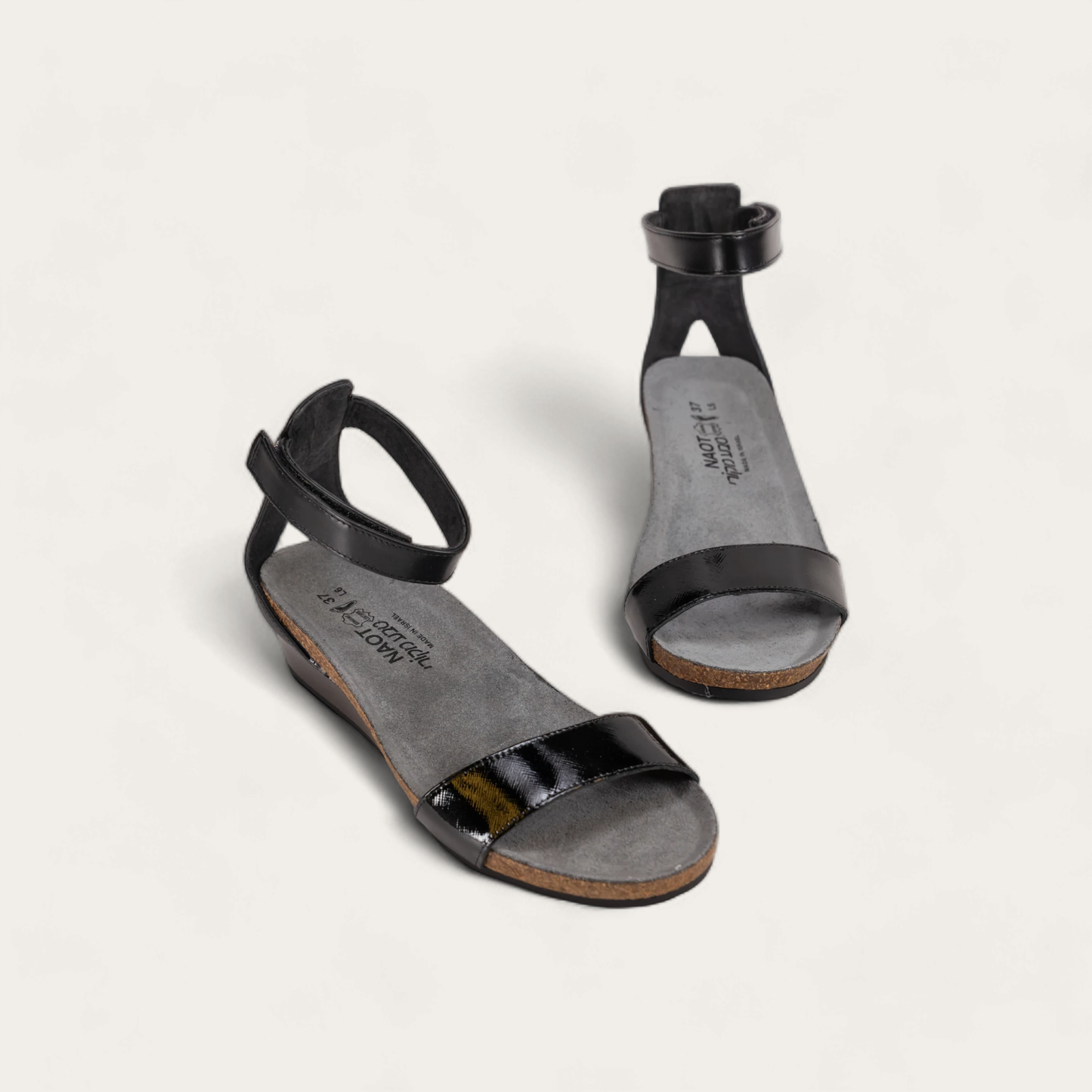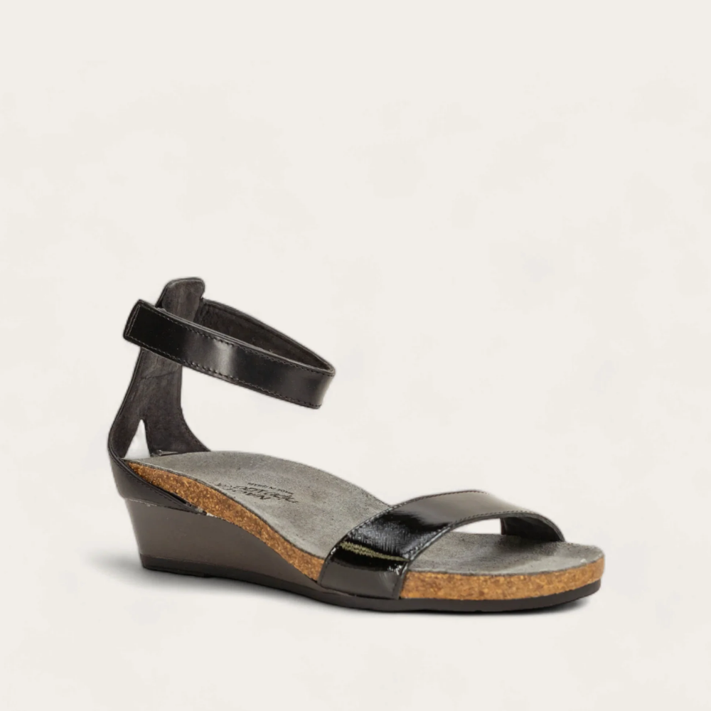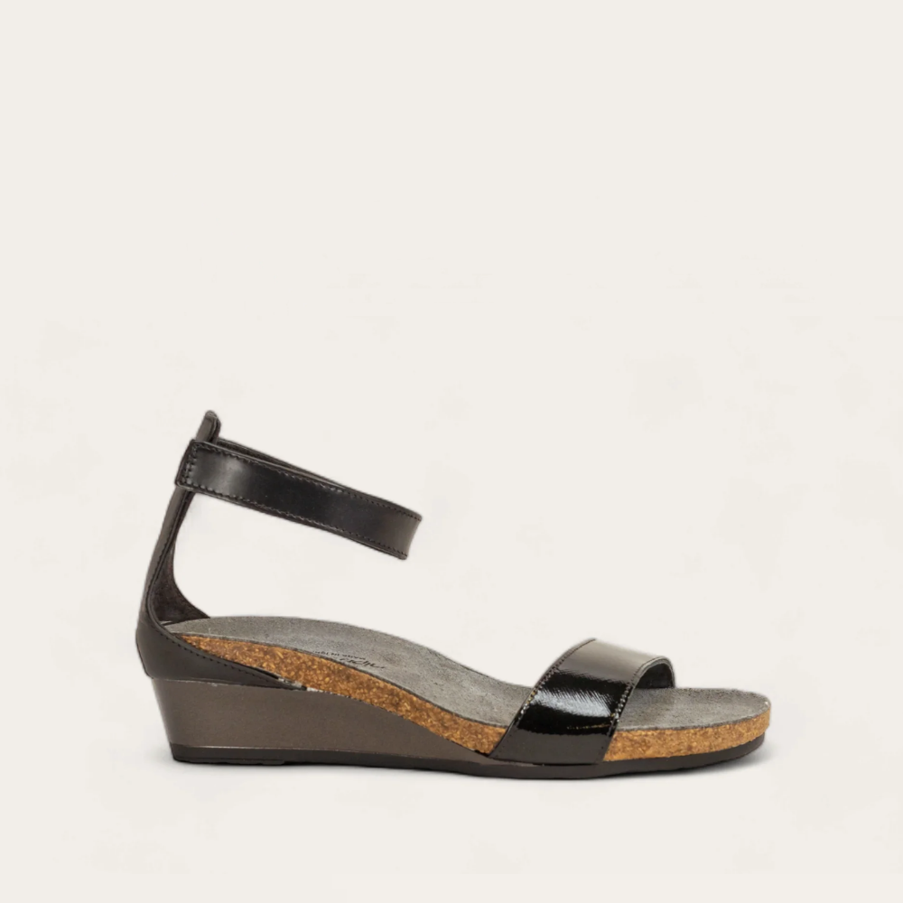 The Naot Pixie is a stylish wedge sandal with contrasting leathers. This style features a hook and loop ankle strap for stability. Naot's anatomic cork and latex footbed is wrapped in a pampering suede and molds to the shape of the foot with wear.