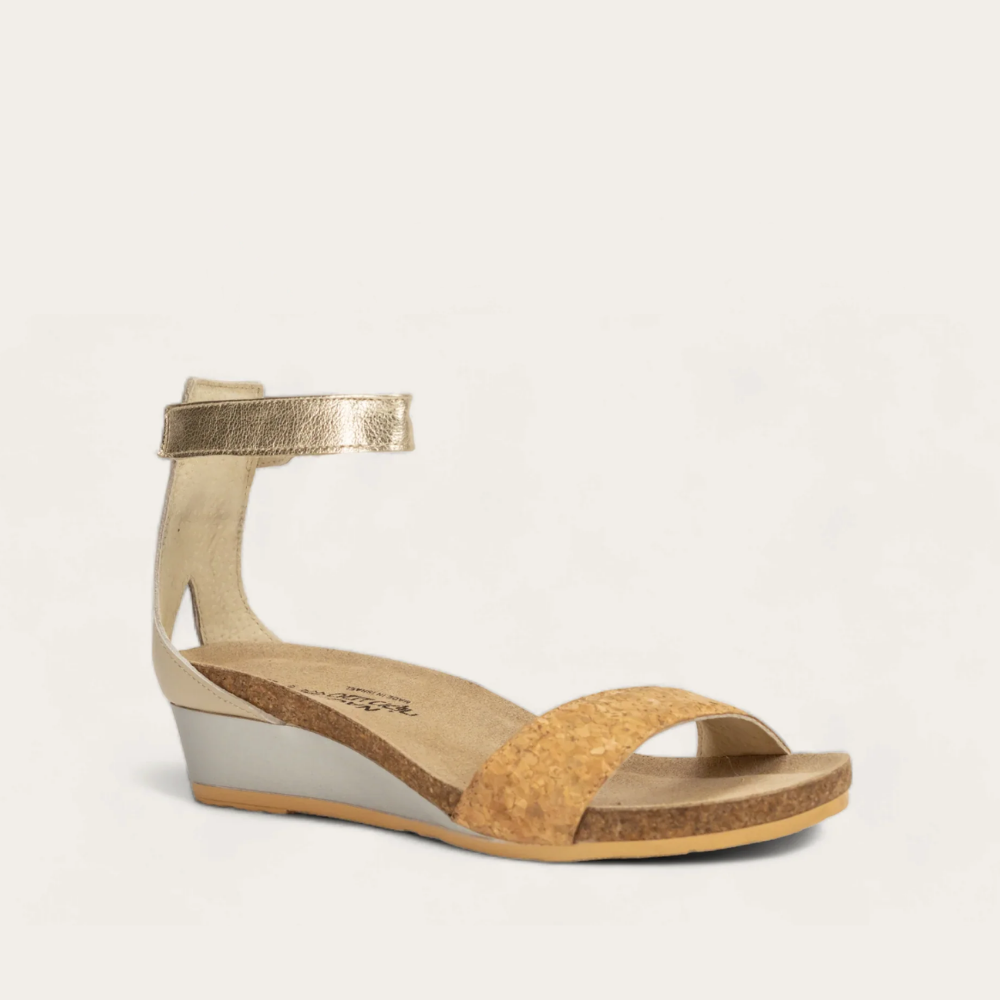 The Naot Pixie is a stylish wedge sandal with contrasting leathers. This style features a hook and loop ankle strap for stability. Naot's anatomic cork and latex footbed is wrapped in a pampering suede and molds to the shape of the foot with wear.