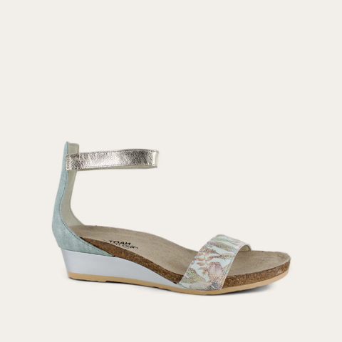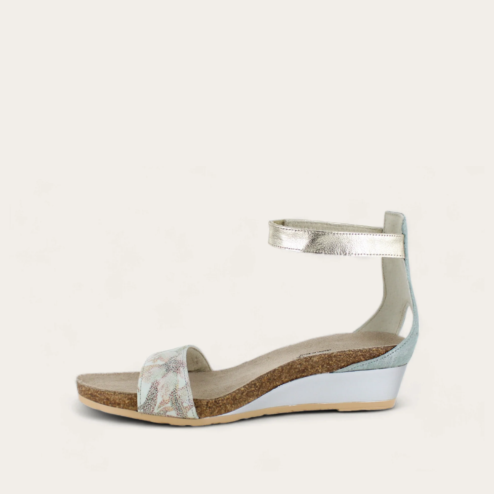 The Naot Pixie is a stylish wedge sandal with contrasting leathers. This style features a hook and loop ankle strap for stability. Naot's anatomic cork and latex footbed is wrapped in a pampering suede and molds to the shape of the foot with wear.
