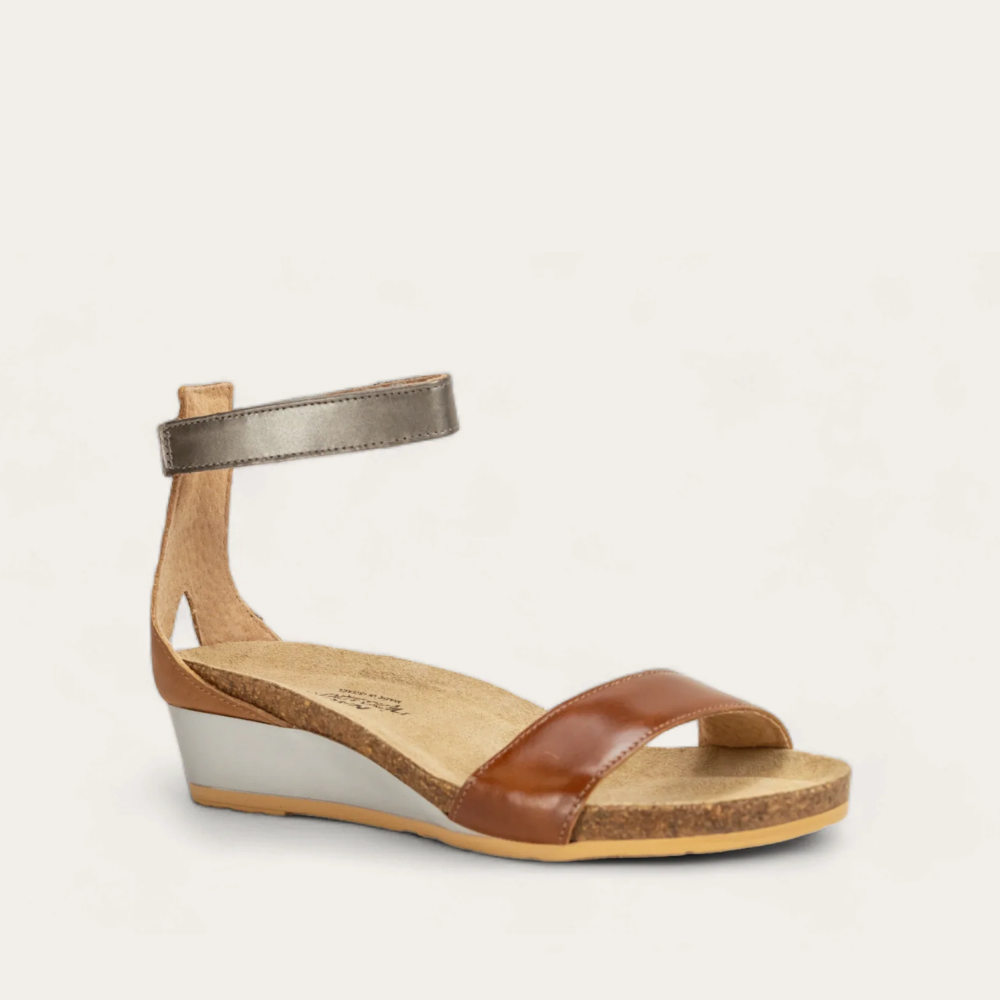 The Naot Pixie is a stylish wedge sandal with contrasting leathers. This style features a hook and loop ankle strap for stability. Naot's anatomic cork and latex footbed is wrapped in a pampering suede and molds to the shape of the foot with wear.