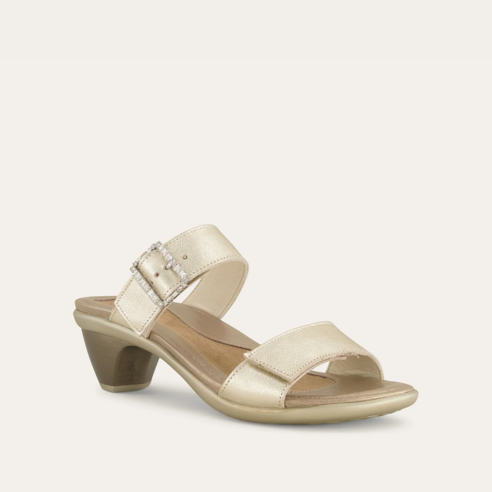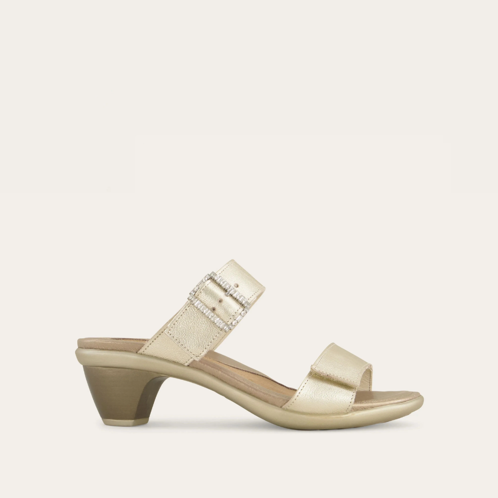 Recent is a stylish sandal that is sure to catch attention. This captivating style showcases a jeweled buckle on a padded front strap, and a hook and loop ankle strap for a secure and personalized fit. Part of the Avantgarde Collection, this sandal boasts a TPR sole with a metal shank, providing the illusion of a 2" heel without sacrificing comfort.