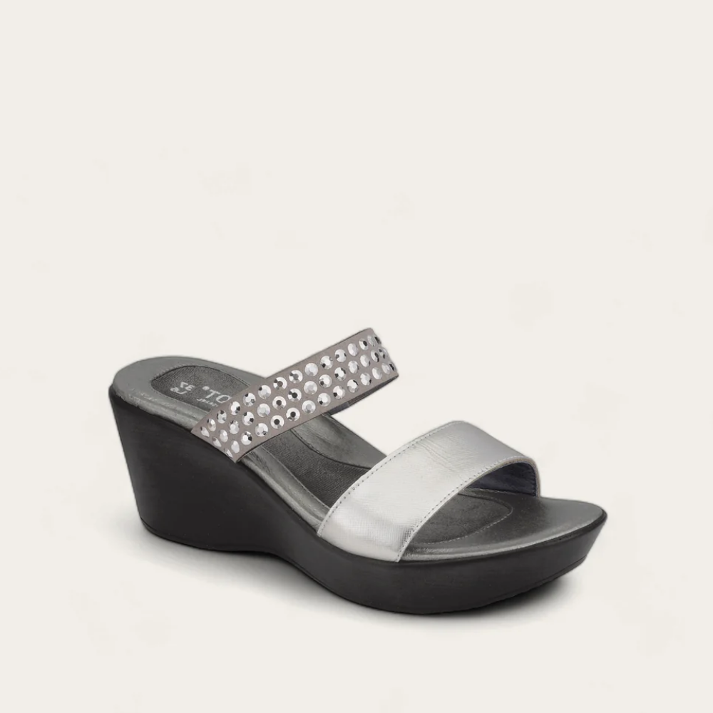 The Response is a fashionable slide wedge sandal with rhinestone accents on the instep strap. This sandal has an inside gore and a padded front strap. Naot's anatomic cork and latex footbed is wrapped in leather with a microfiber center to prevent slipping and molds to the shape of the foot with wear. The Impulse Collection features a TPR sole which is extremely lightweight. This sole offers the look of a 2.75 inch wedge without the feel.