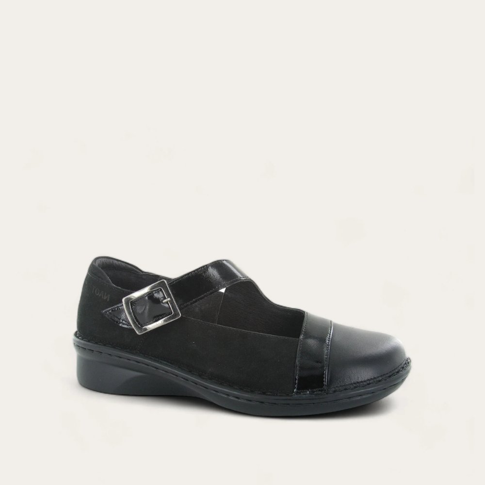 The Rhythm is a great everyday maryjane with contrasting leathers. This style features a padded heel cup and a slightly wider fit. Naot's removable, anatomic cork and latex footbed is wrapped in pampering suede and molds to the shape of the foot with wear. The Allegro Collection features a 1.5" polyurethane sole which is extremely lightweight and durable. Our patented Naot Replacement Footbeds are also available for Rhythm.