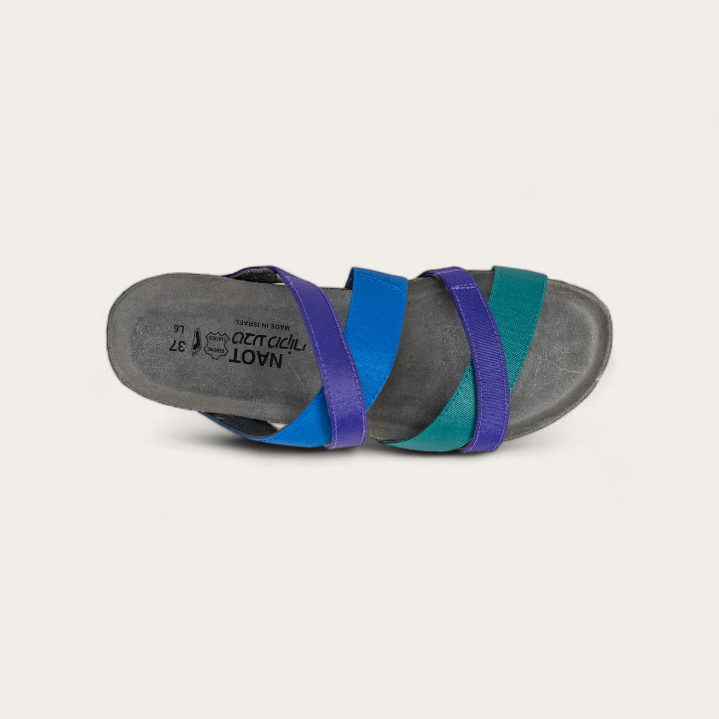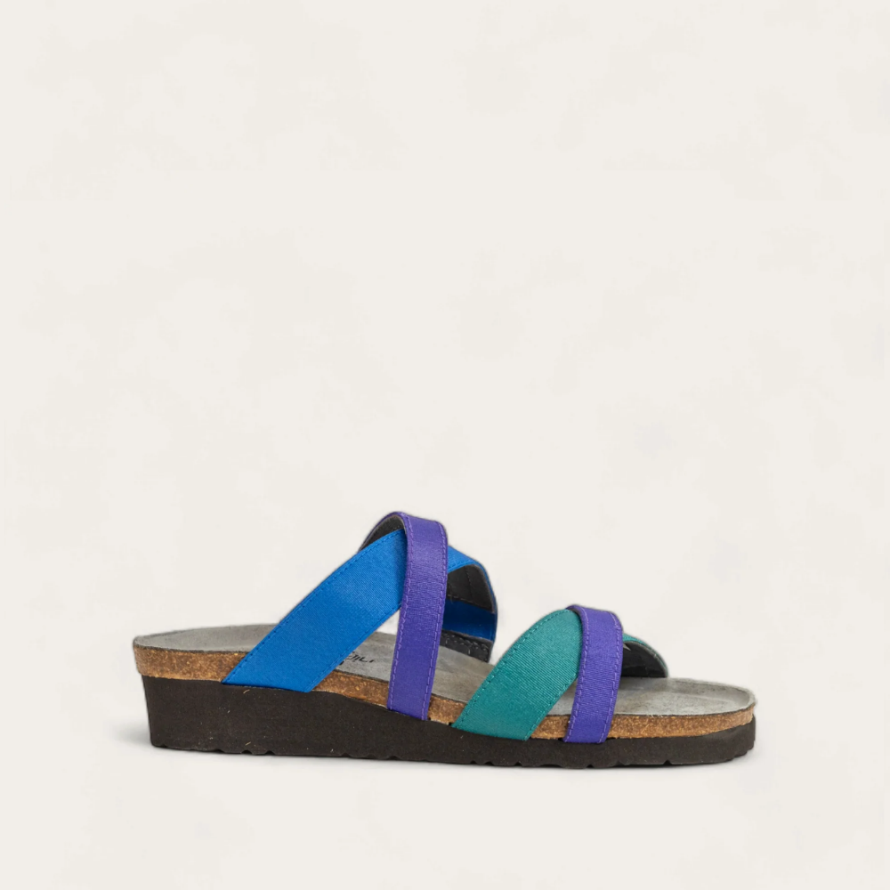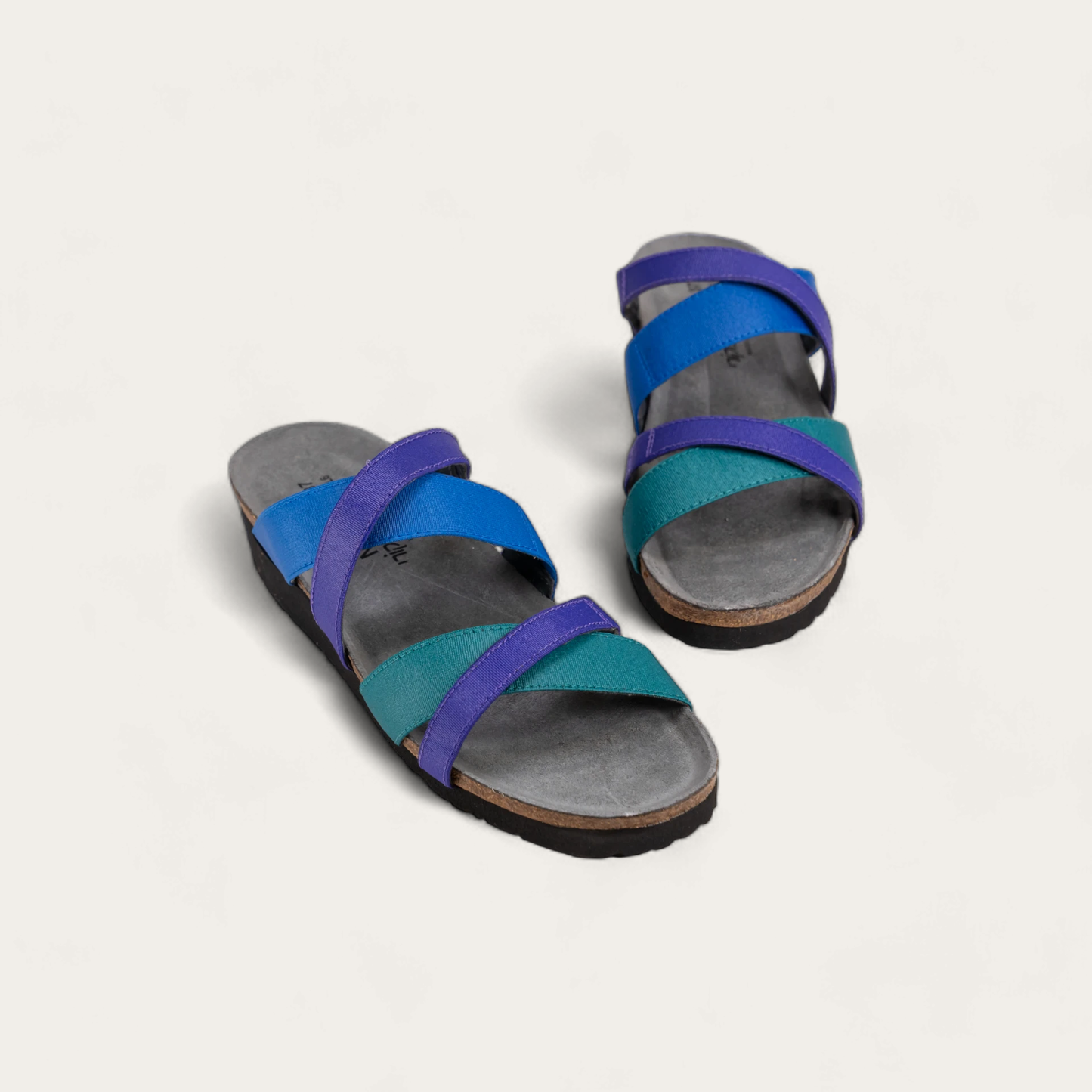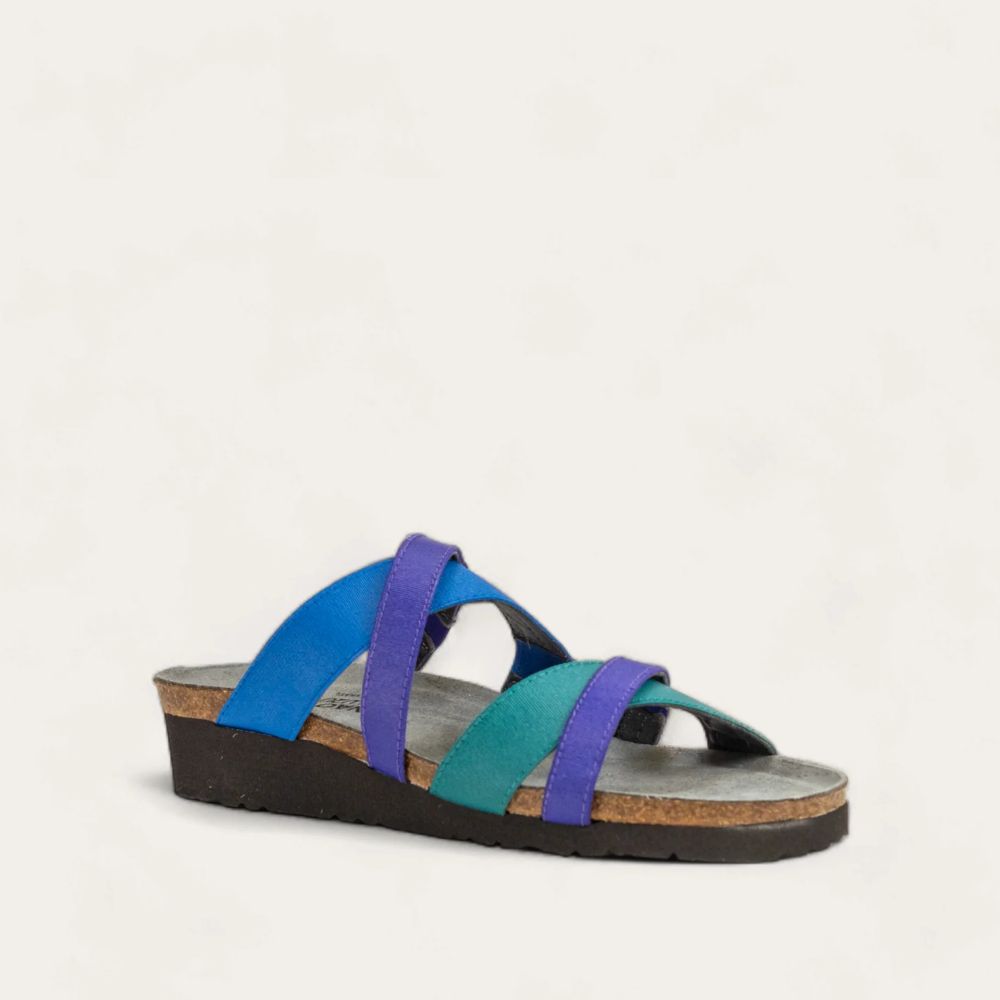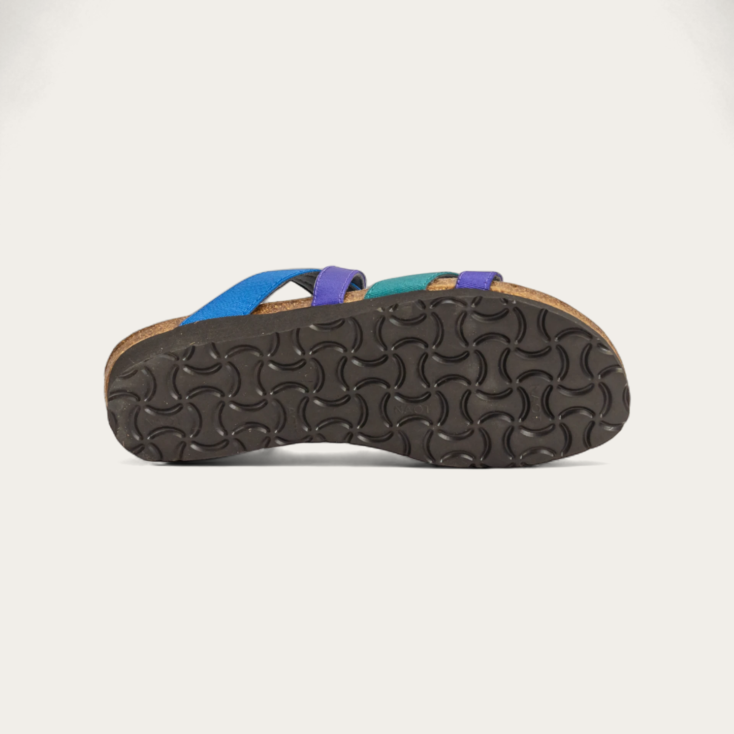 The Roxanna is a fashionable slide with contrasting colors. This sandal has padded technical lining creating comfort and absorbing moisture. The Roxanna features gore at the instep and front straps for adjustability. Naot's anatomic cork and latex footbed is wrapped in a pampering suede and molds to the shape of the foot with wear.
