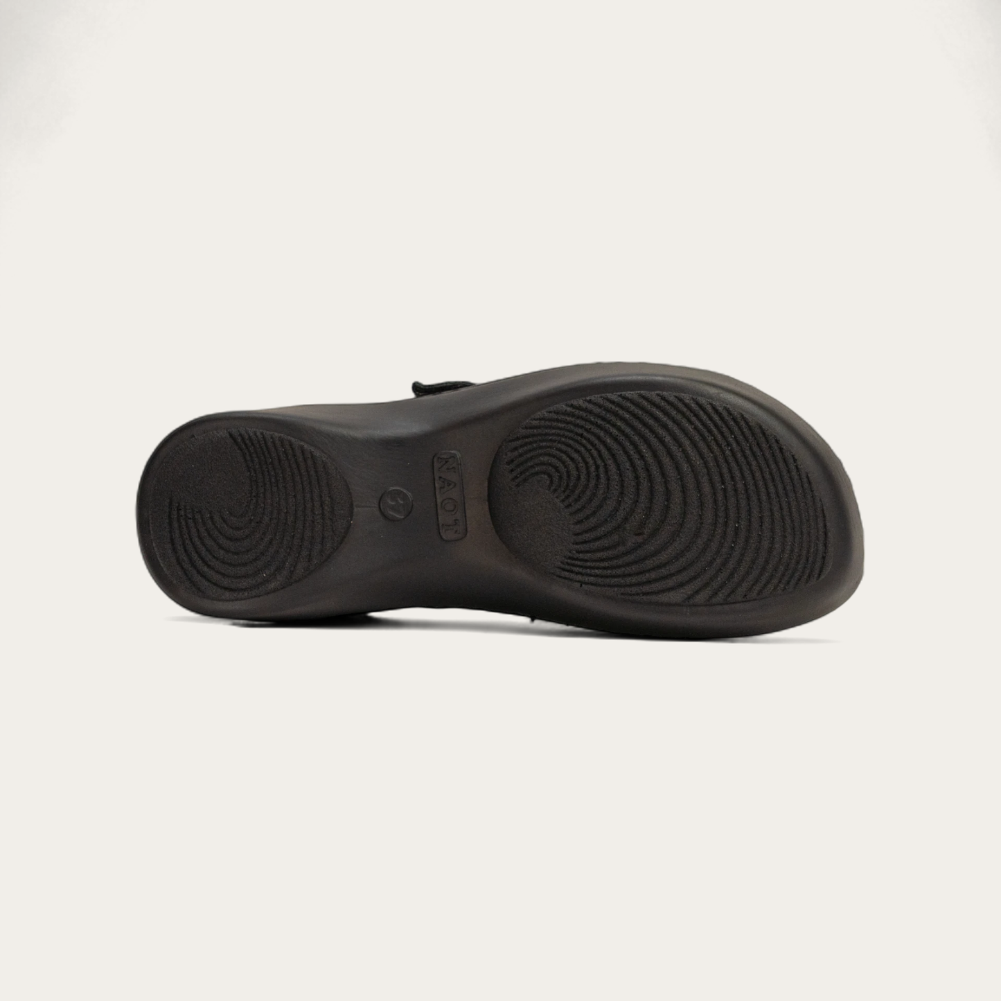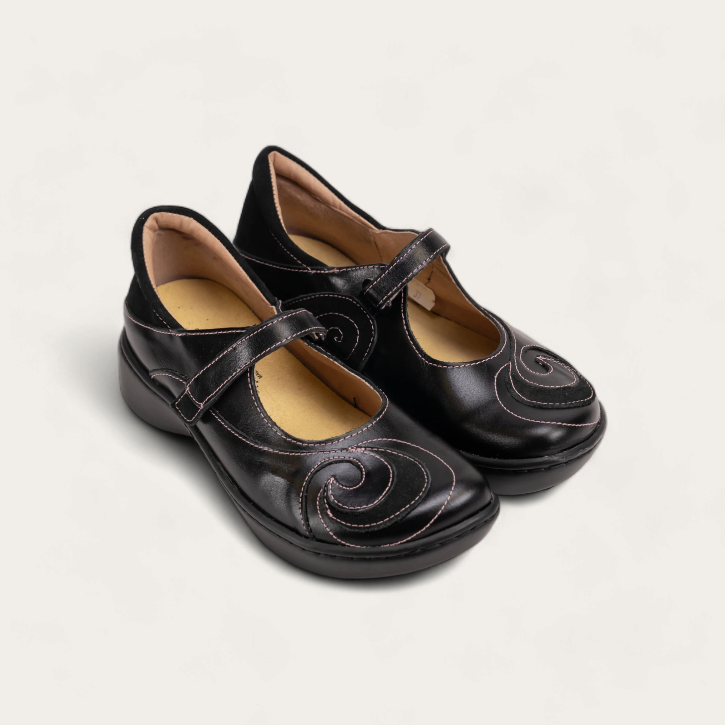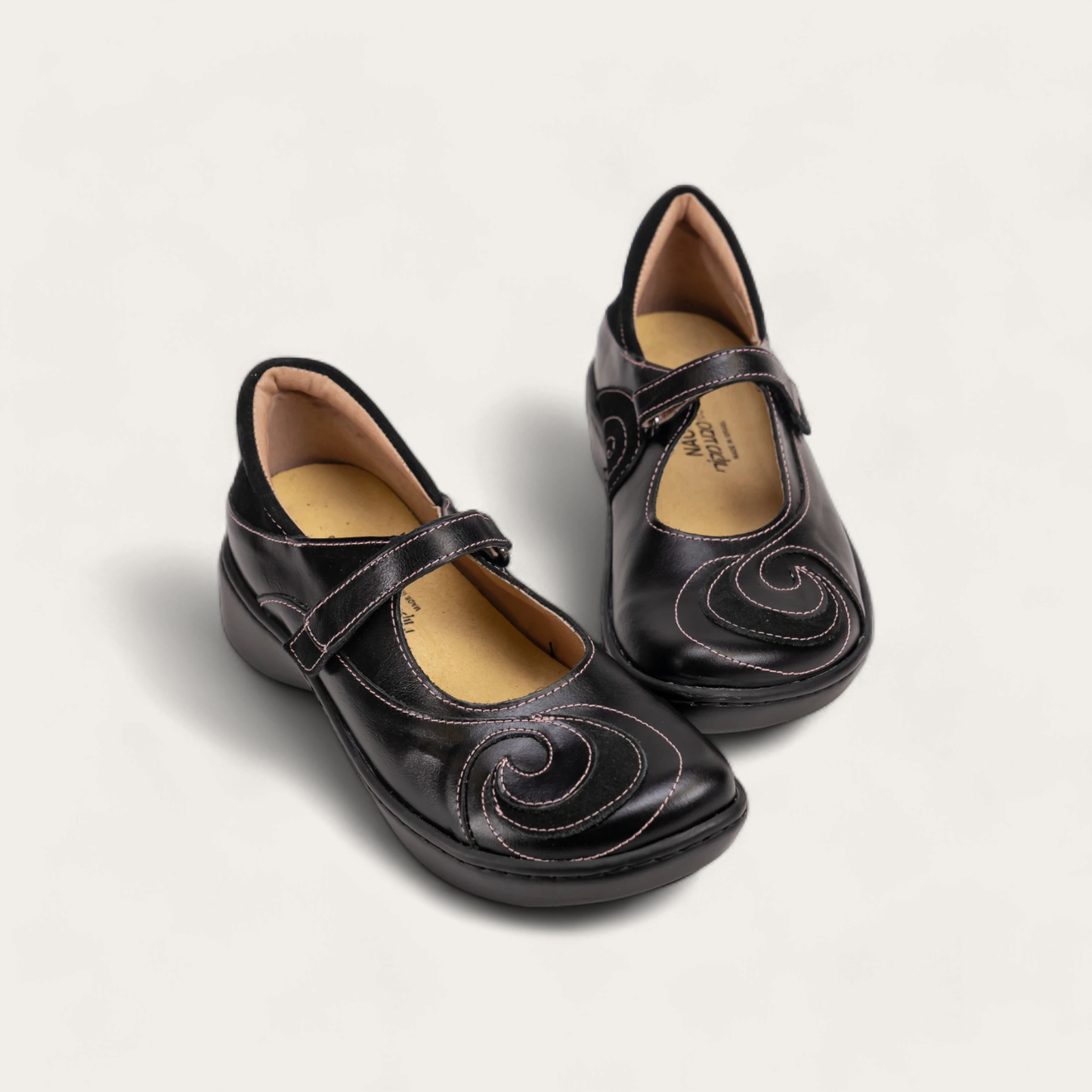 The Sea is a maryjane with a unique contrasting swirl design. This style has a padded heel cup for ultimate comfort and a hook and loop closure for adjustability. Naot's removable, anatomic cork and latex footbed is wrapped in pampering suede and molds to the shape of the foot with wear. The Shell Collection features a 1.5" polyurethane sole which is extremely lightweight, durable and lip resistant. Our patented Naot Replacement Footbeds are also available for Sea.